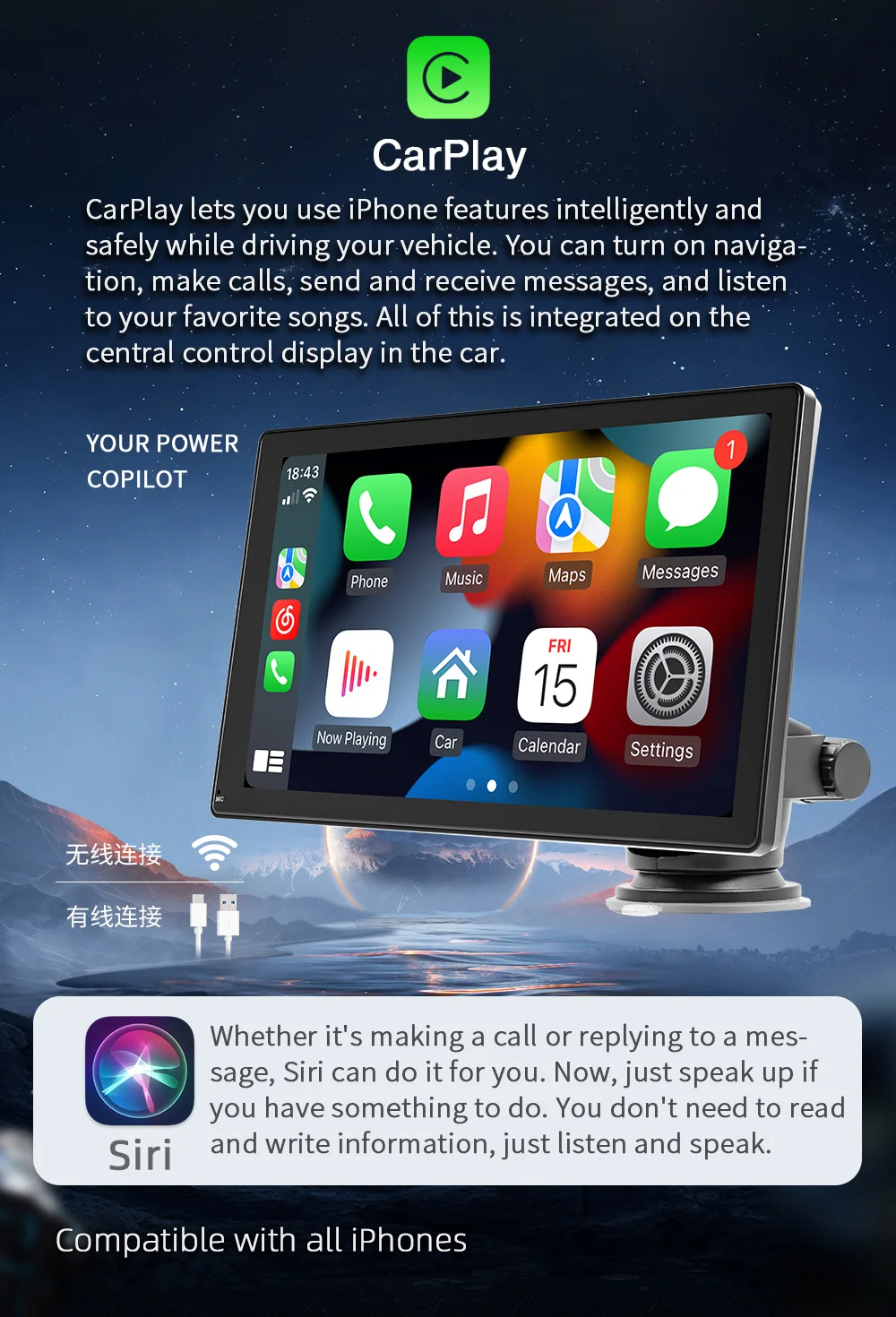 Funkcijos : Stereo, „CarPlay“, „Mirror Link“, kelių kalbų palaikymas, „Android Auto“, įmontuotas garsiakalbis