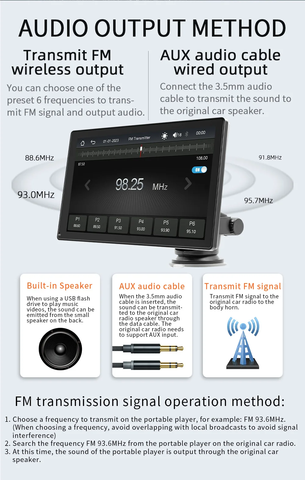 1. Radijo dažnių perdavimo funkcija 2. SD kortelė U diskas (garsas / vaizdas / paveikslėlis)
