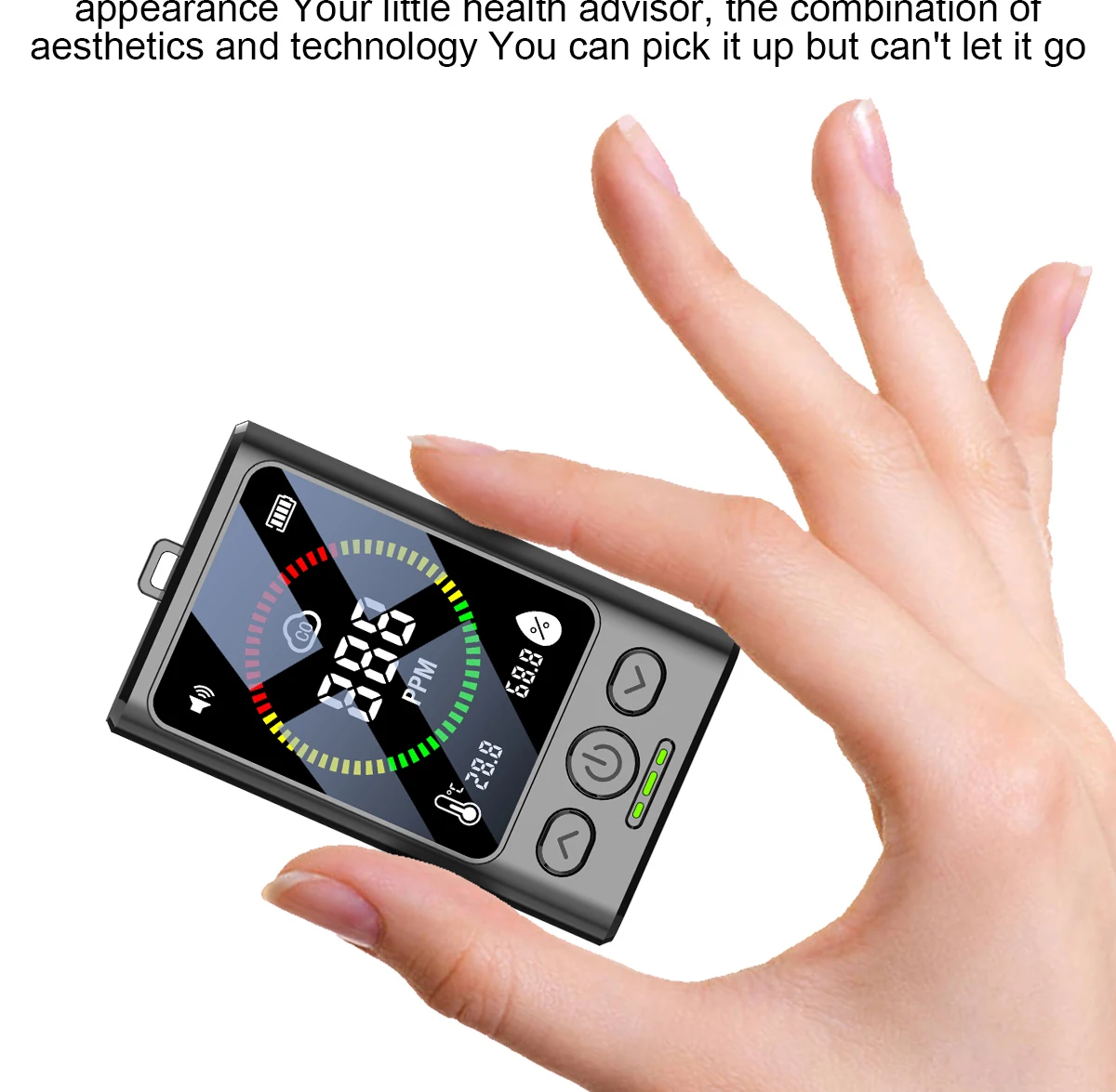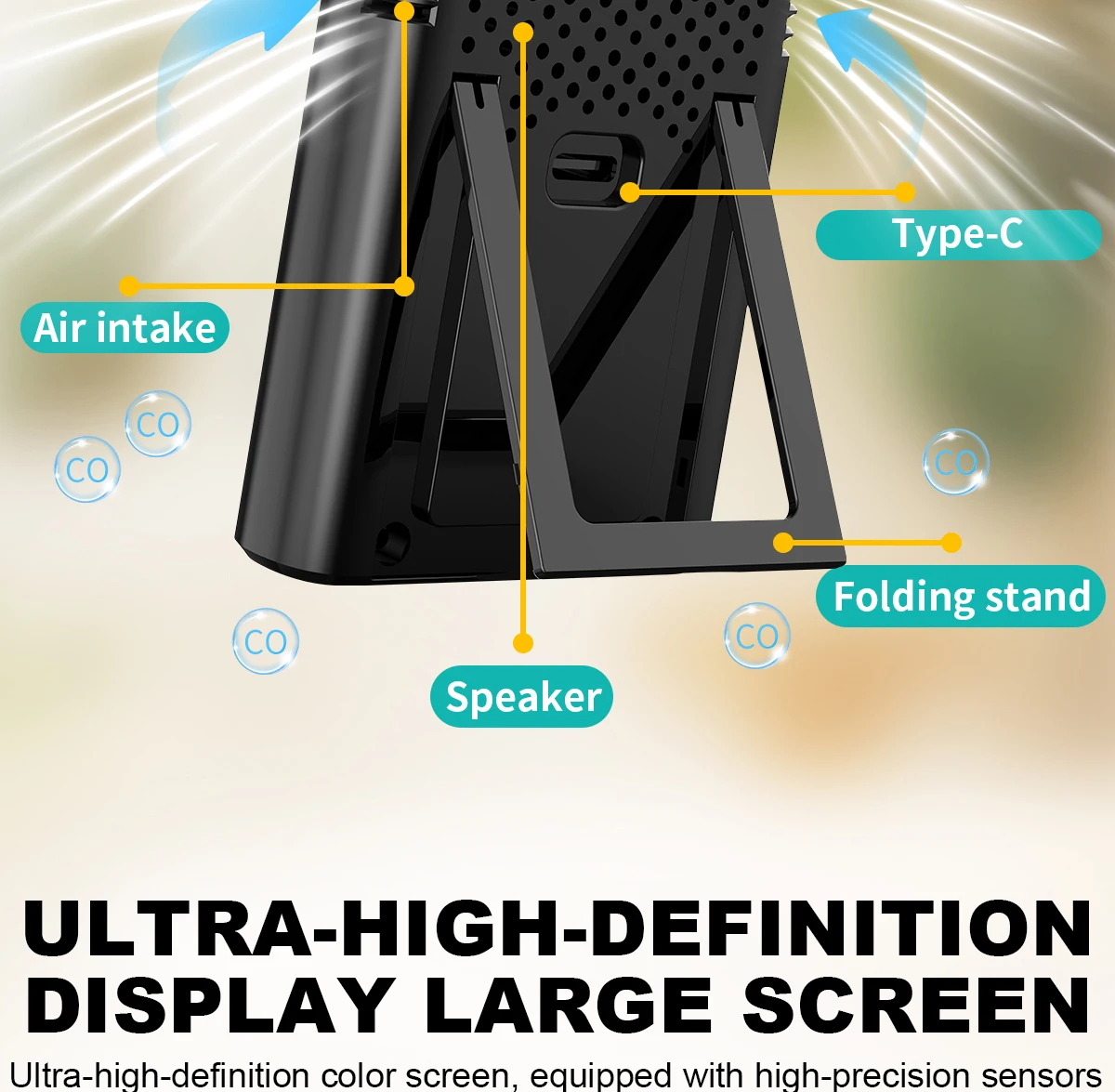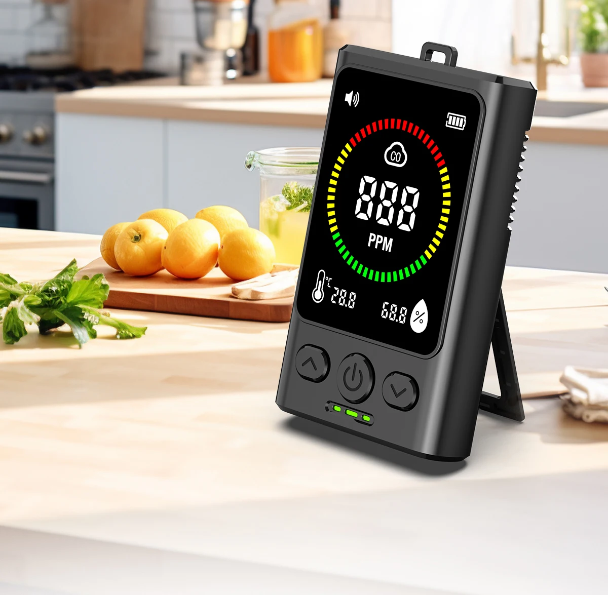 Nešiojamas skaitmeninis CO matuoklis – kompaktiškas ir lengvas dizainas su virvelės sagtimi ir sulankstomu stovu, lengvai nešiojamas namuose, biure, mokykloje, virtuvėje ar kemperyje. Puikus nešiojamas CO detektorius saugumui patalpose ir kelionėse.