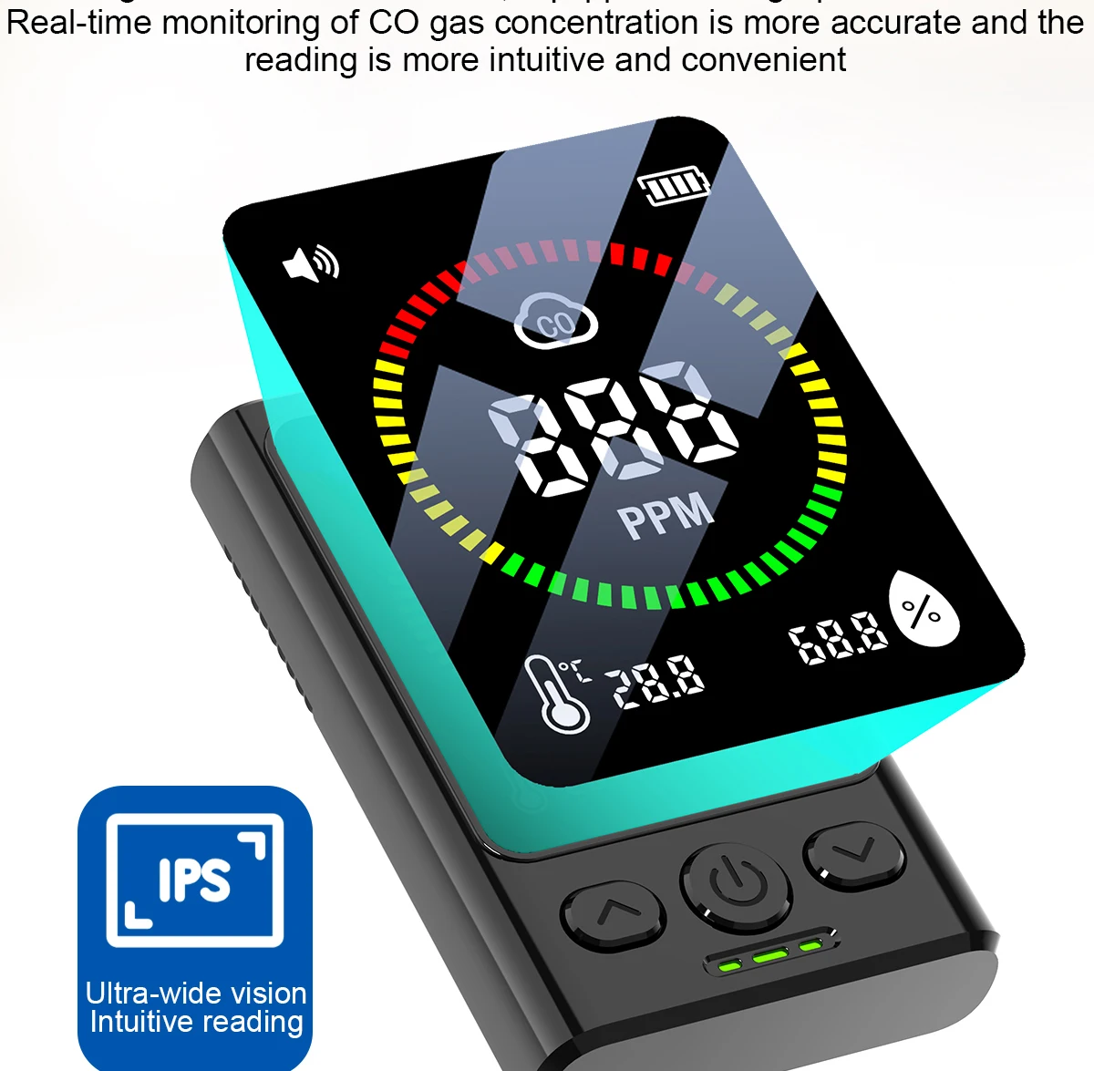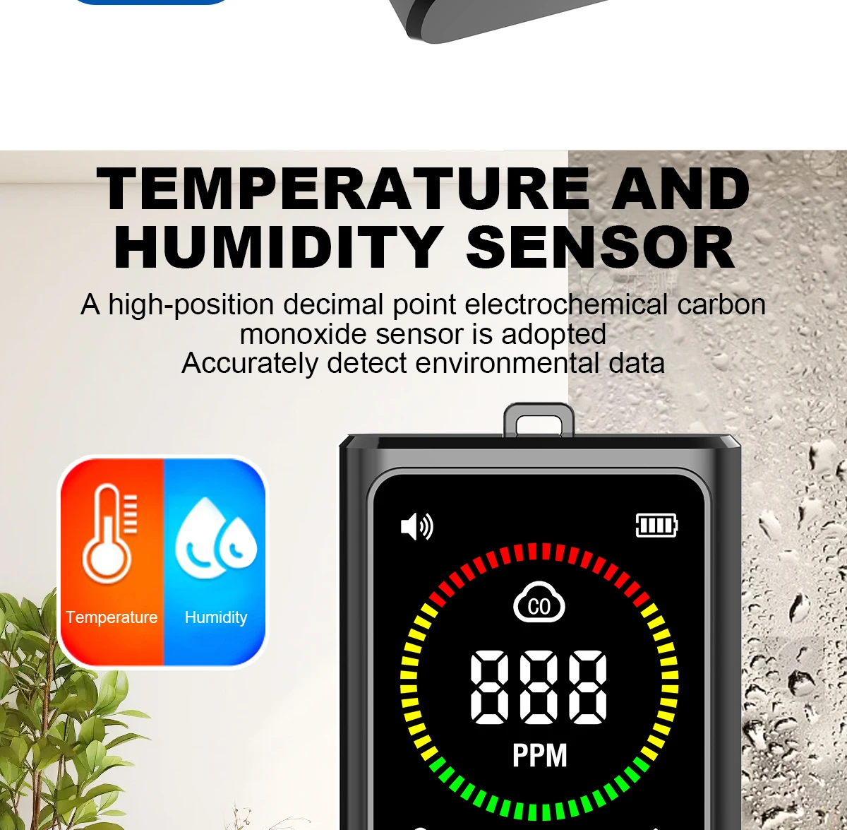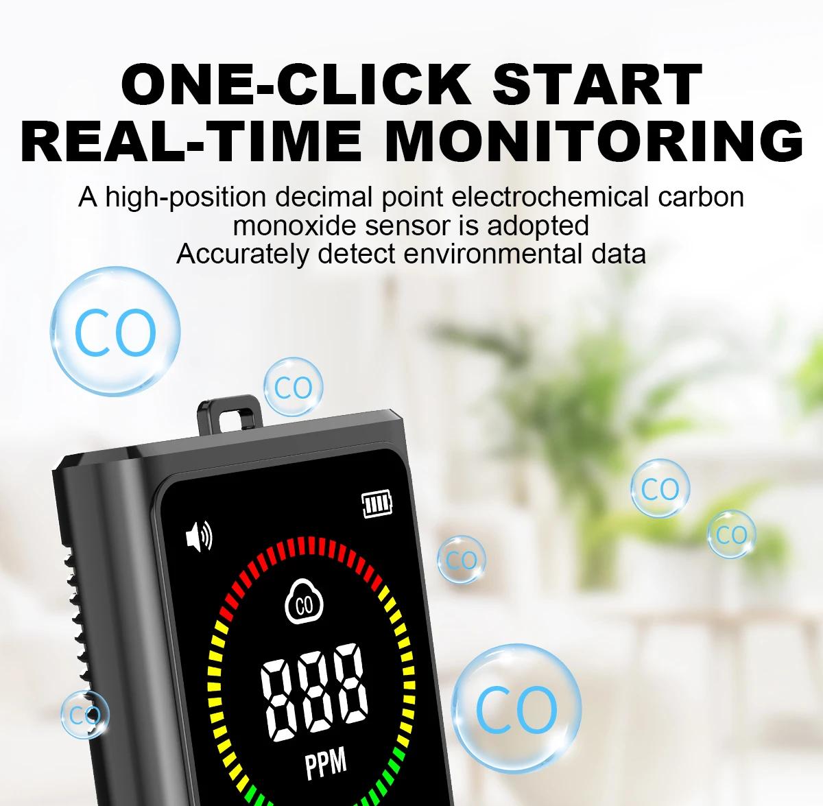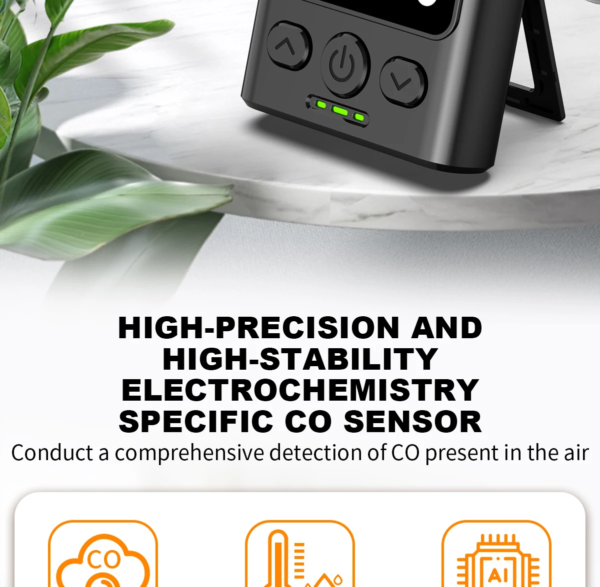 Didelio tikslumo anglies monoksido detektorius – šis anglies monoksido detektorius su elektrocheminiu CO jutikliu ir skaitmeniniu ekranu užtikrina tikslų stebėjimą nuo 0 iki 999 ppm su 2 sekundžių atnaujinimo dažniu.