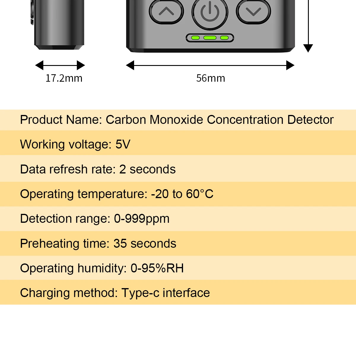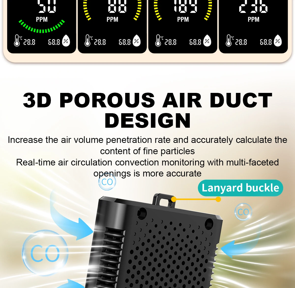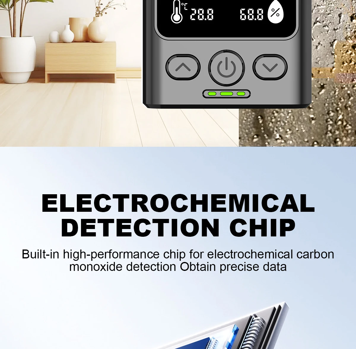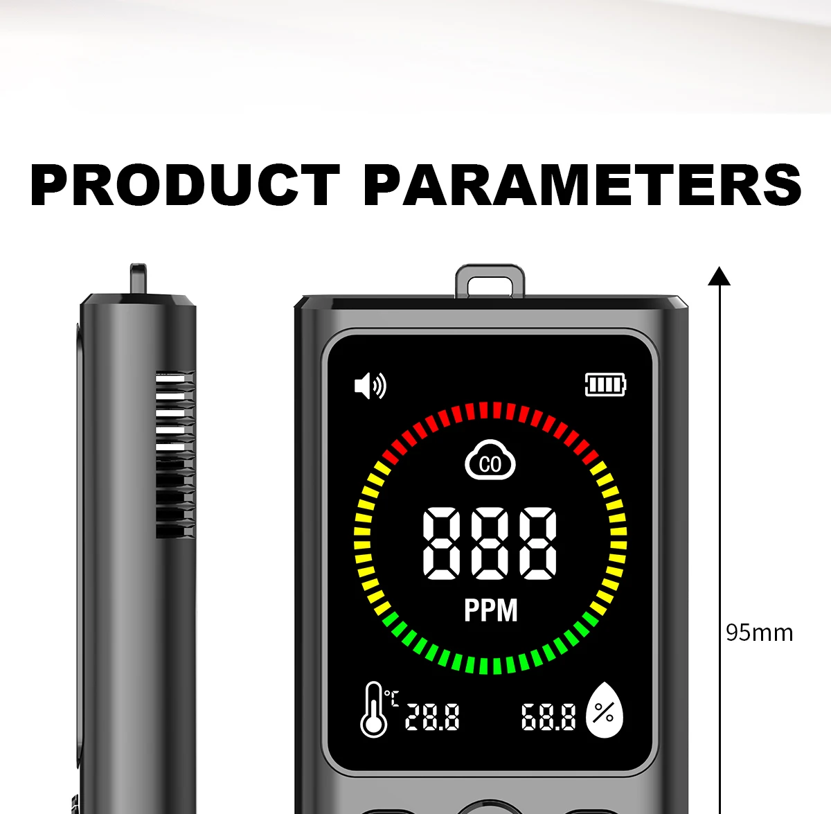 Didelio tikslumo anglies monoksido detektorius – šis anglies monoksido detektorius su elektrocheminiu CO jutikliu ir skaitmeniniu ekranu užtikrina tikslų stebėjimą nuo 0 iki 999 ppm su 2 sekundžių atnaujinimo dažniu.