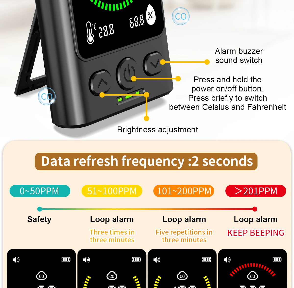 Stebėjimas realiuoju laiku su įspėjimais – turi kilpinį aliarmo signalą, LED ekraną ir temperatūros / drėgmės jutiklį, užtikrinančius savalaikius įspėjimus, kai CO koncentracija viršija saugų lygį. Tinka naudoti kaip anglies monoksido testeris patalpose.