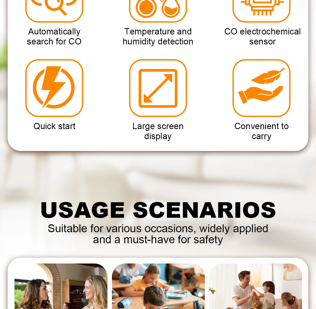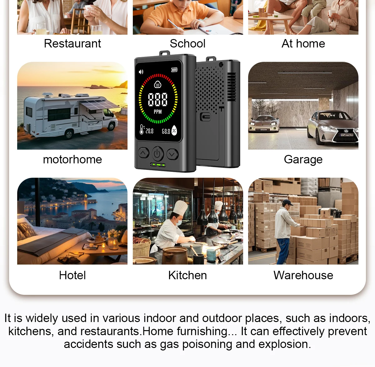 Plataus pritaikymo saugos įrenginys – idealiai tinka namų, garažų, restoranų, viešbučių, sandėlių ir virtuvių saugumui užtikrinti. Šis mini skaitmeninis CO matuoklis skirtas šeimoms, vairuotojams ir darbuotojams, kuriems svarbiausia saugumas uždarose erdvėse.