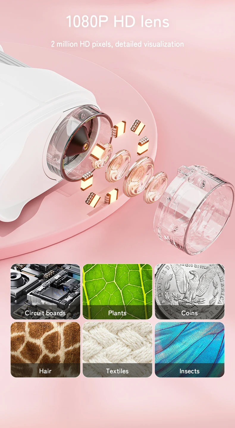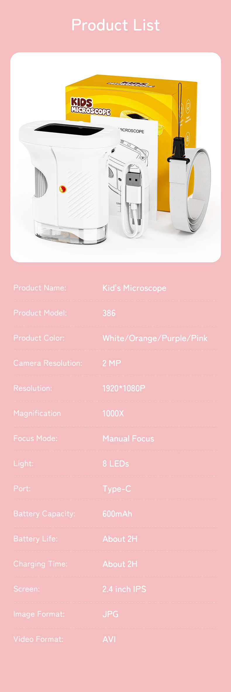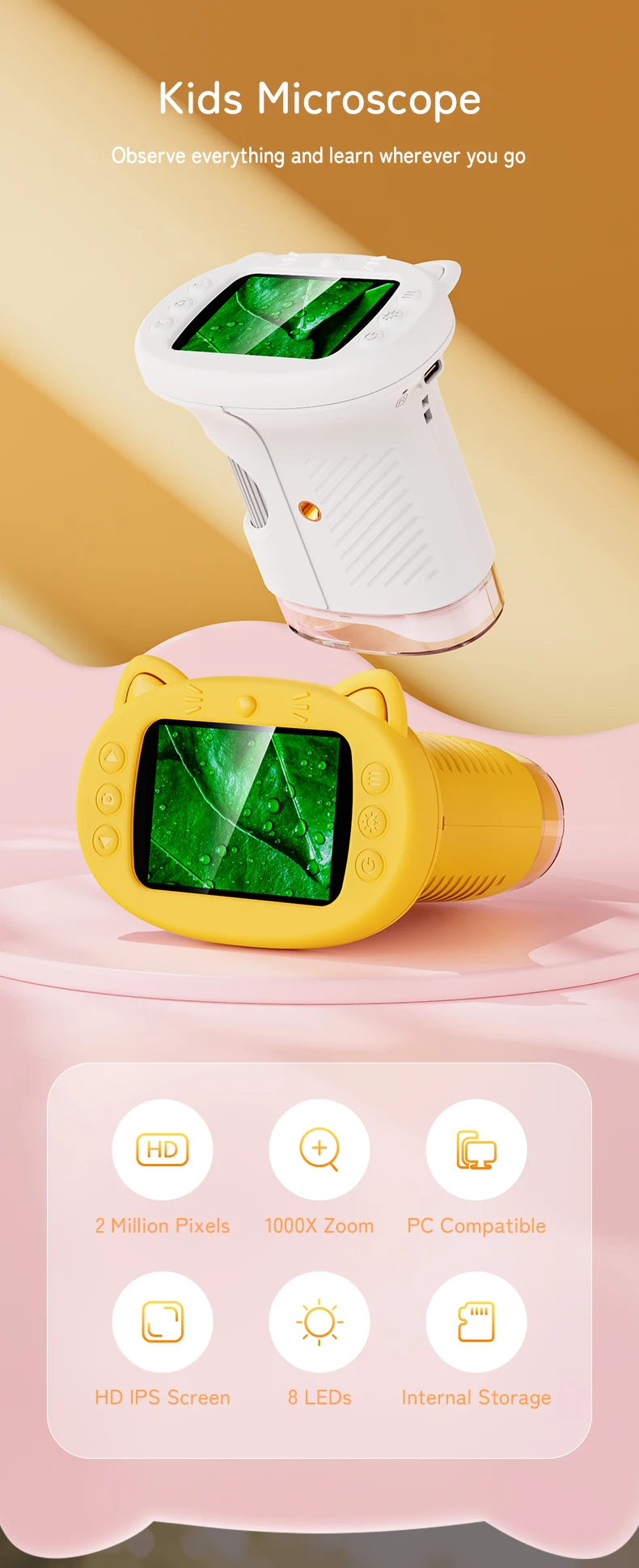 Skaitmeninis mikroskopas vaikams, žaislams, 1000X nešiojamas mikroskopas su 2,4 colio IPS ekranu, mokslinis žaislas su nuotraukų ir vaizdo įrašymo funkcija