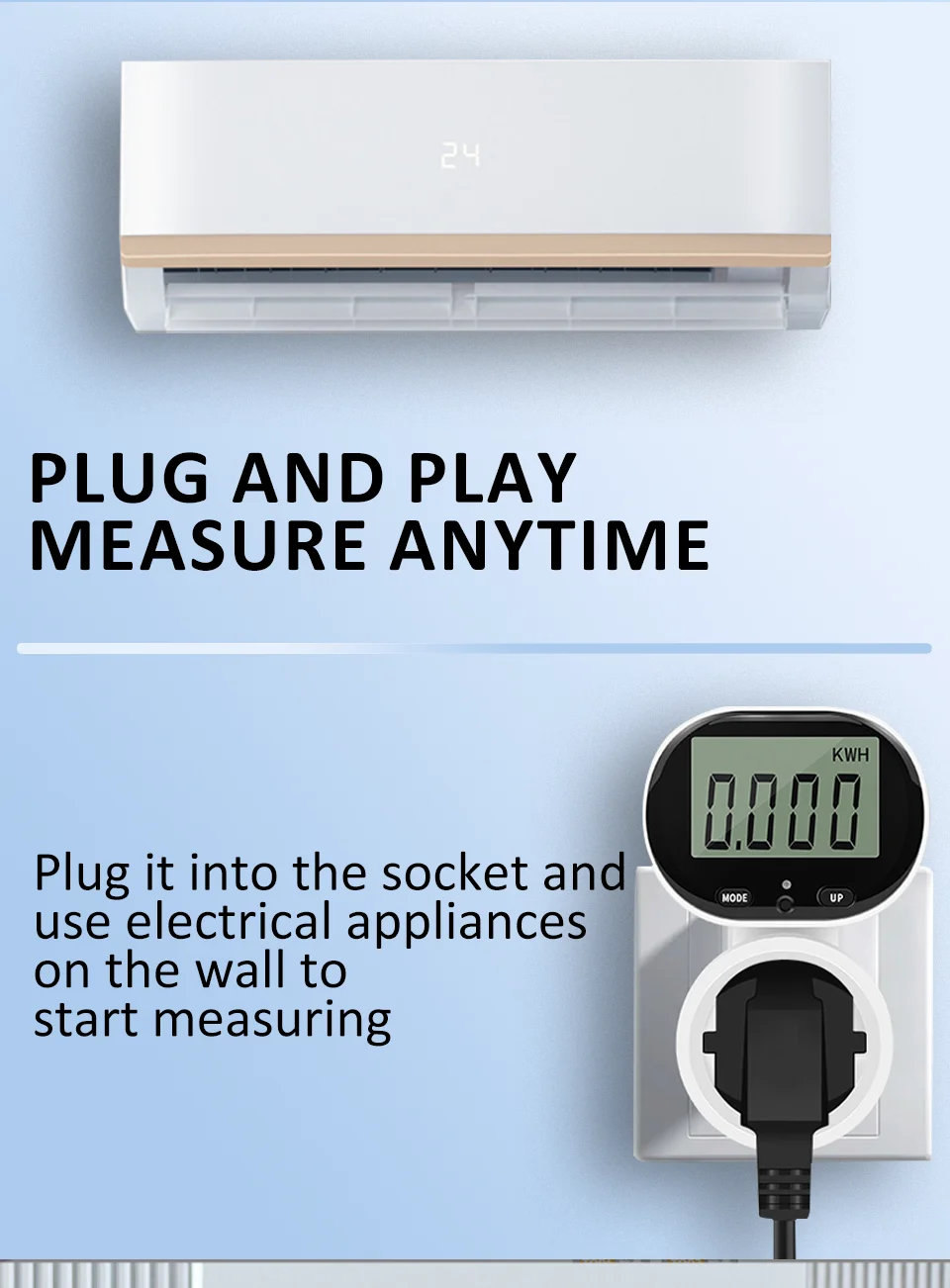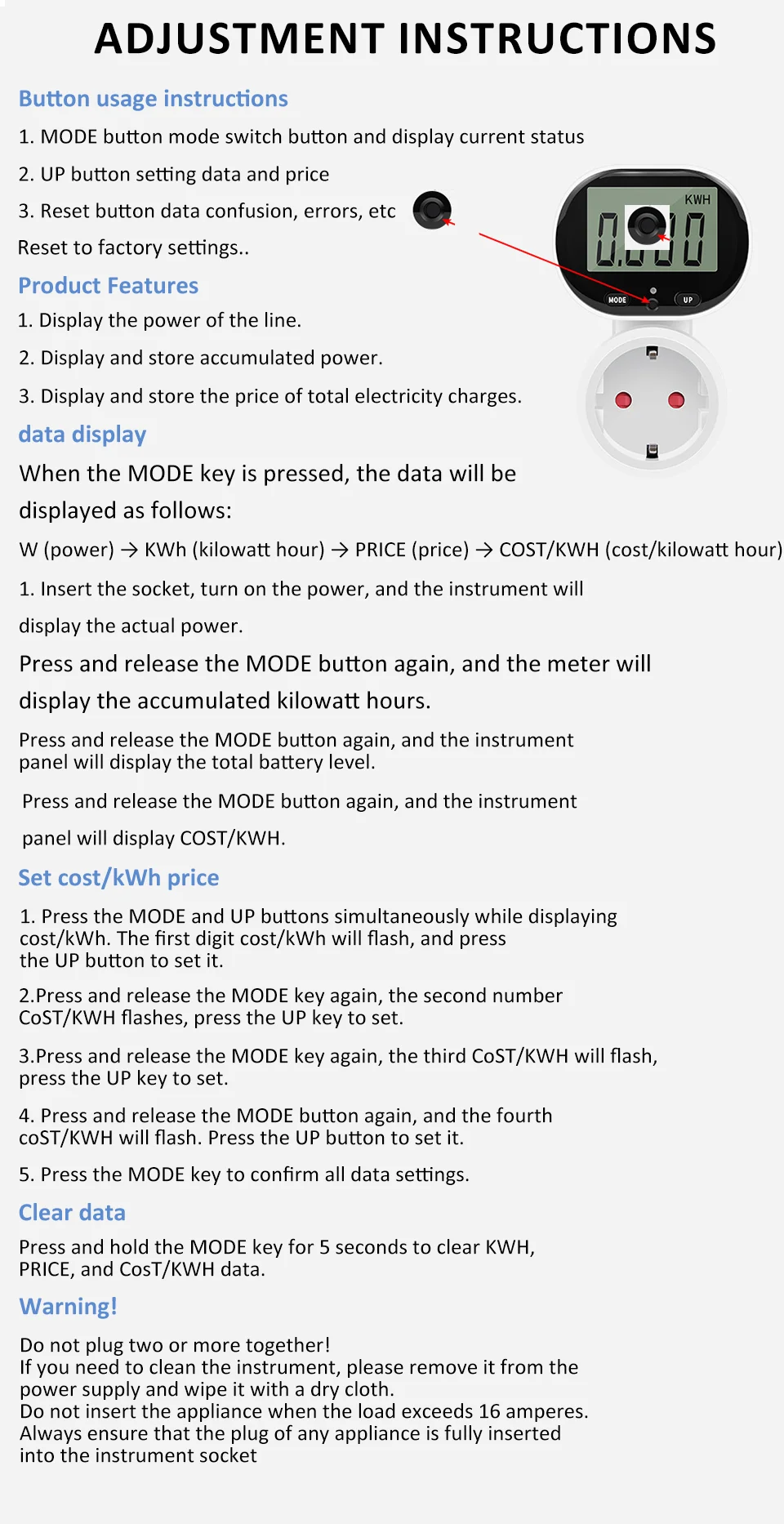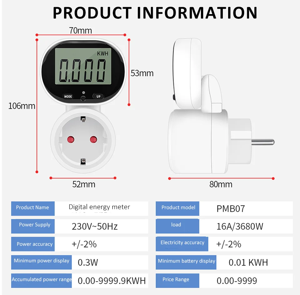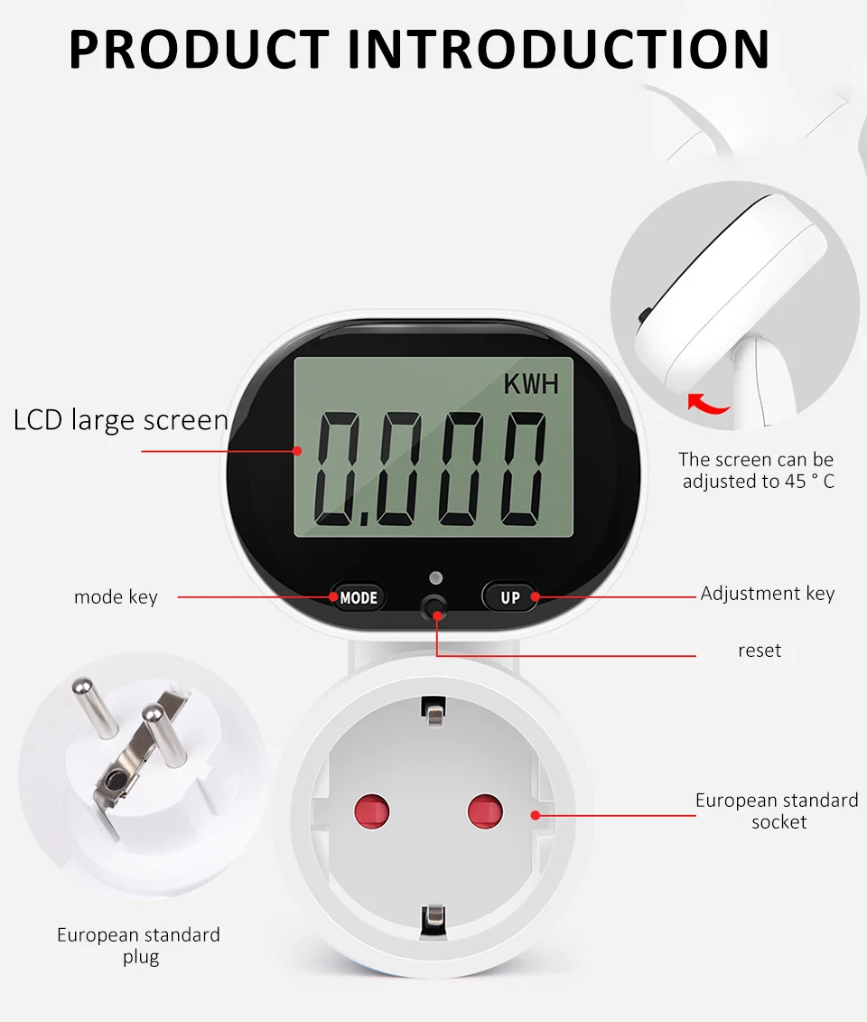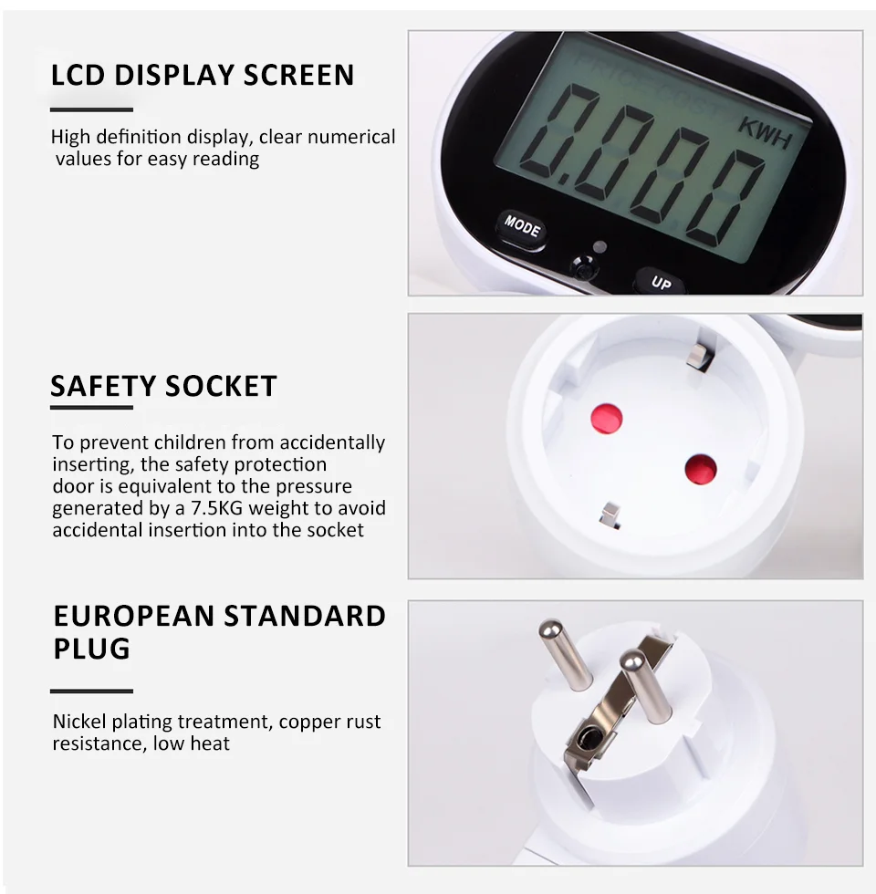 -Daugiafunkcis lizdas: šis gaminys gali ne tik automatiškai apskaičiuoti elektros energijos sąskaitas, bet ir išmatuoti naudojamų prietaisų energijos suvartojimą, įtampą, srovę, laiką ir kt. Jis turi išsamias funkcijas ir yra paprastas naudoti.