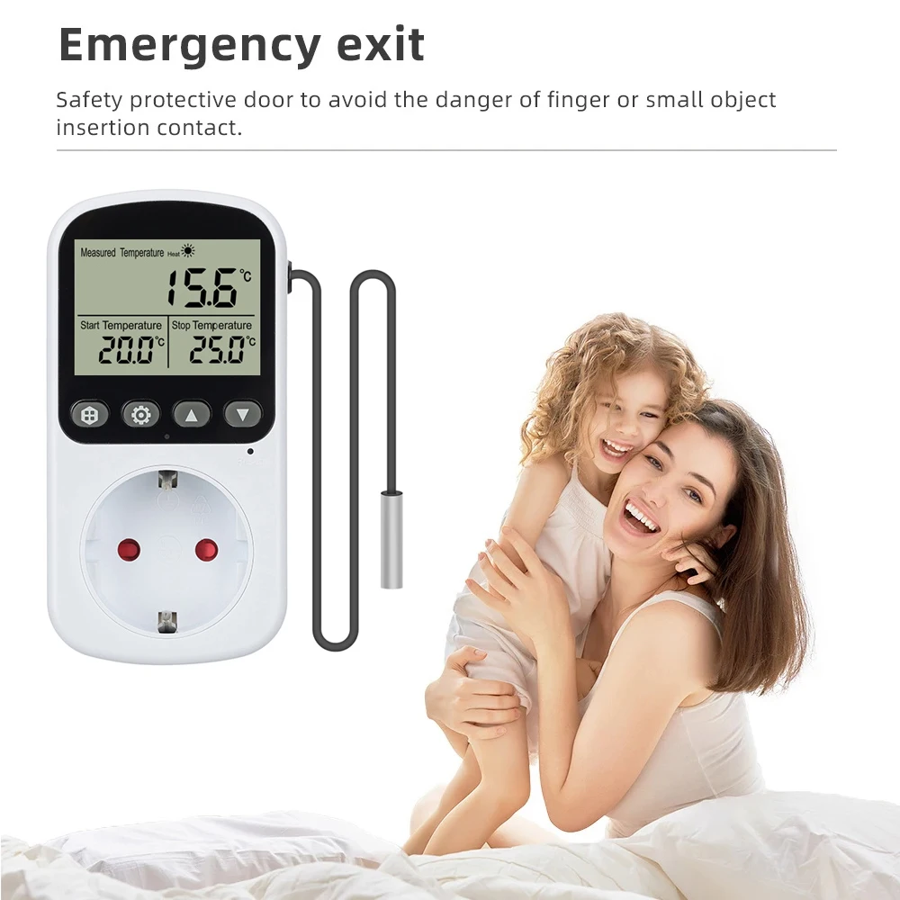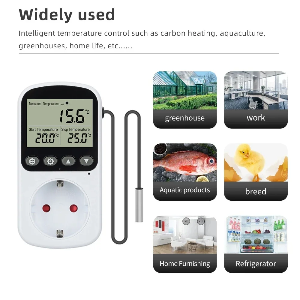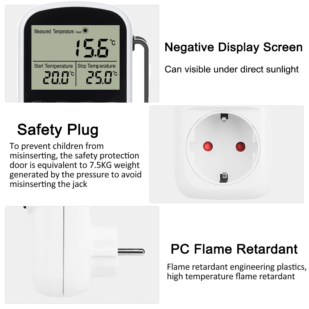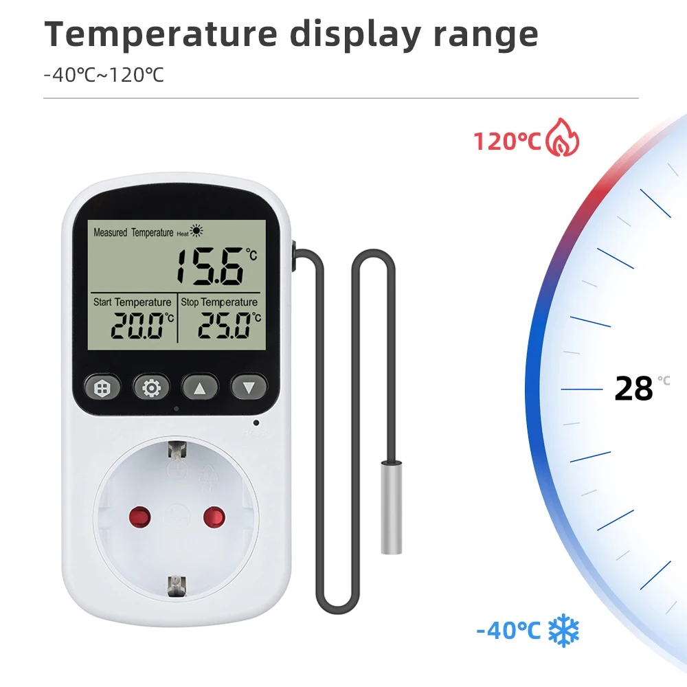 Skaitmeninis temperatūros reguliatorius, kištukinis lizdas, ES kištukinis termostatas su laikmačio jutiklio zondu, šildymo, aušinimo jungiklis, 16A, foninis apšvietimas