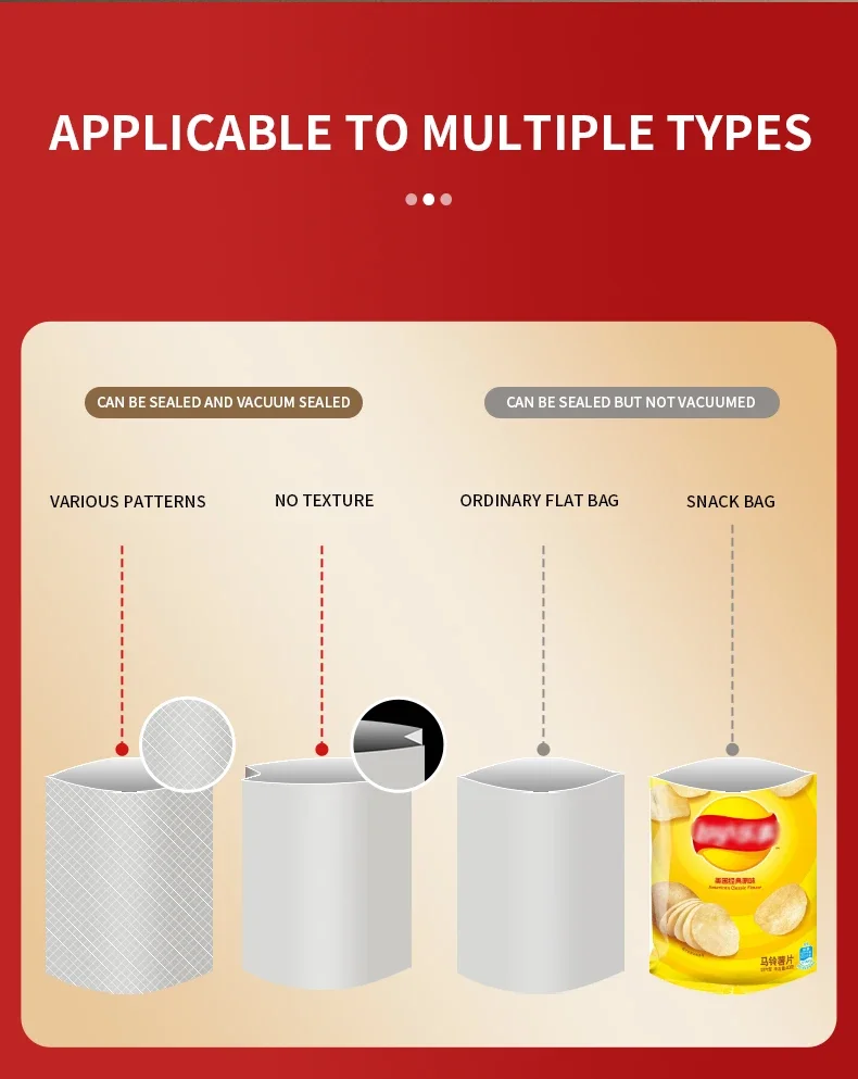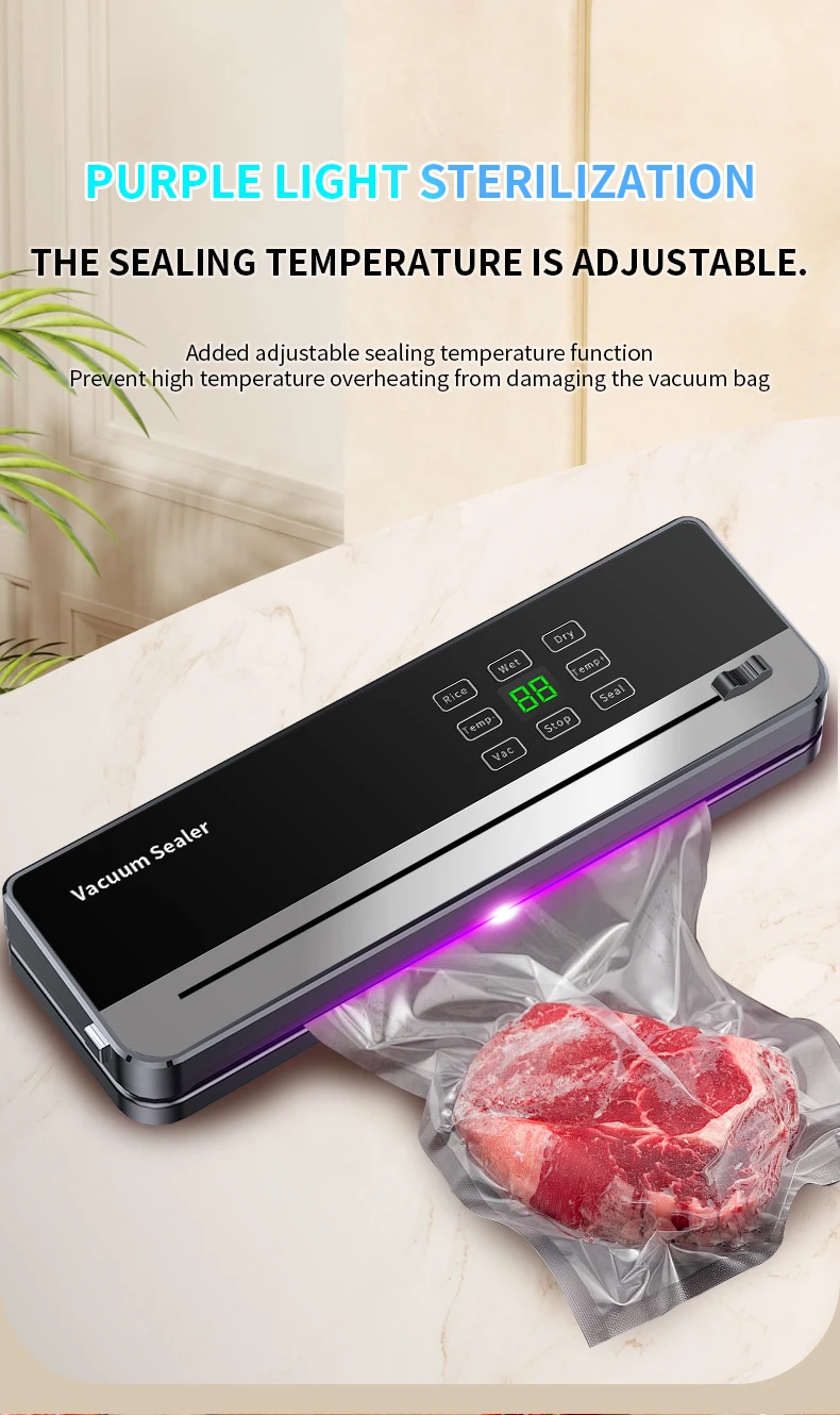 Išbandykite mūsų maisto vakuuminio pakavimo aparato, aprūpinto violetinės šviesos sterilizavimo sistema, užtikrinančia aukščiausio lygio maisto saugą, galią. Platus sandarinimo dizainas užtikrina sandarų sandarinimą, išlaiko maistą šviežią ir sumažina atliekas.