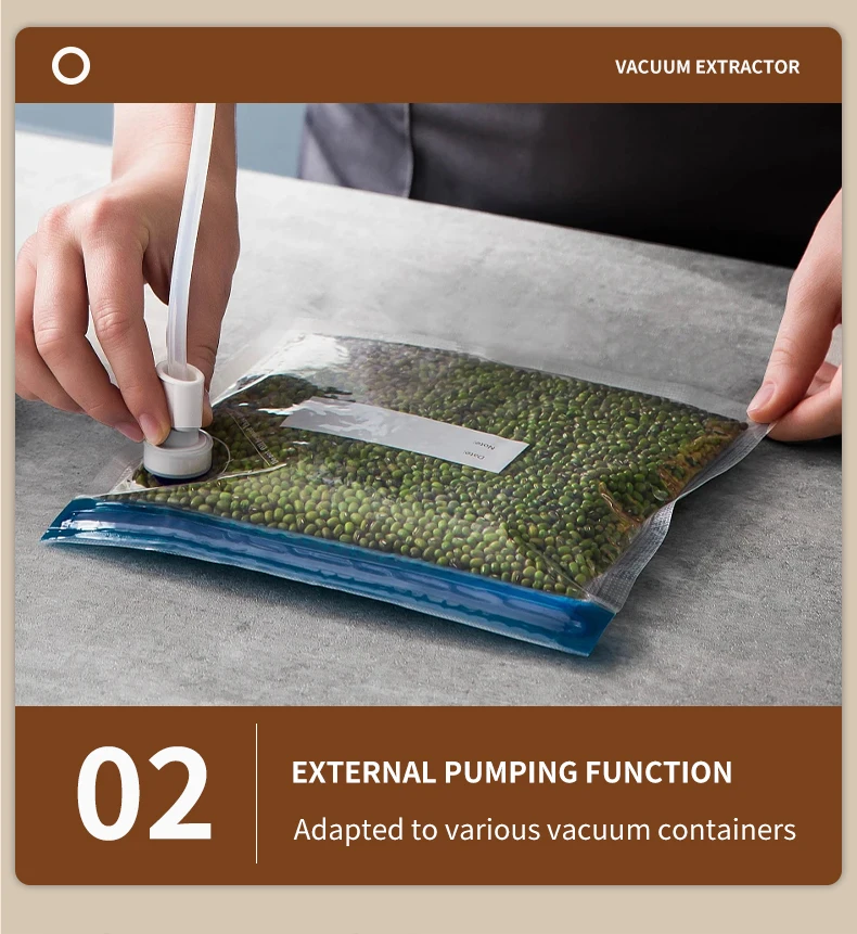 Mūsų maisto sandarinimo mašina yra universalus įrankis, patenkinantis visus jūsų maisto konservavimo poreikius. Nuo sauso/drėgno dvigubo režimo iki ryžių plytų režimo, išorinio vakuuminio siurbimo režimo ir sandarinimo režimo – mes pasirūpinsime jumis. Be to, galingas 65 kPa siurbimo galingumas garantuoja saugų sandarinimą kiekvieną kartą.