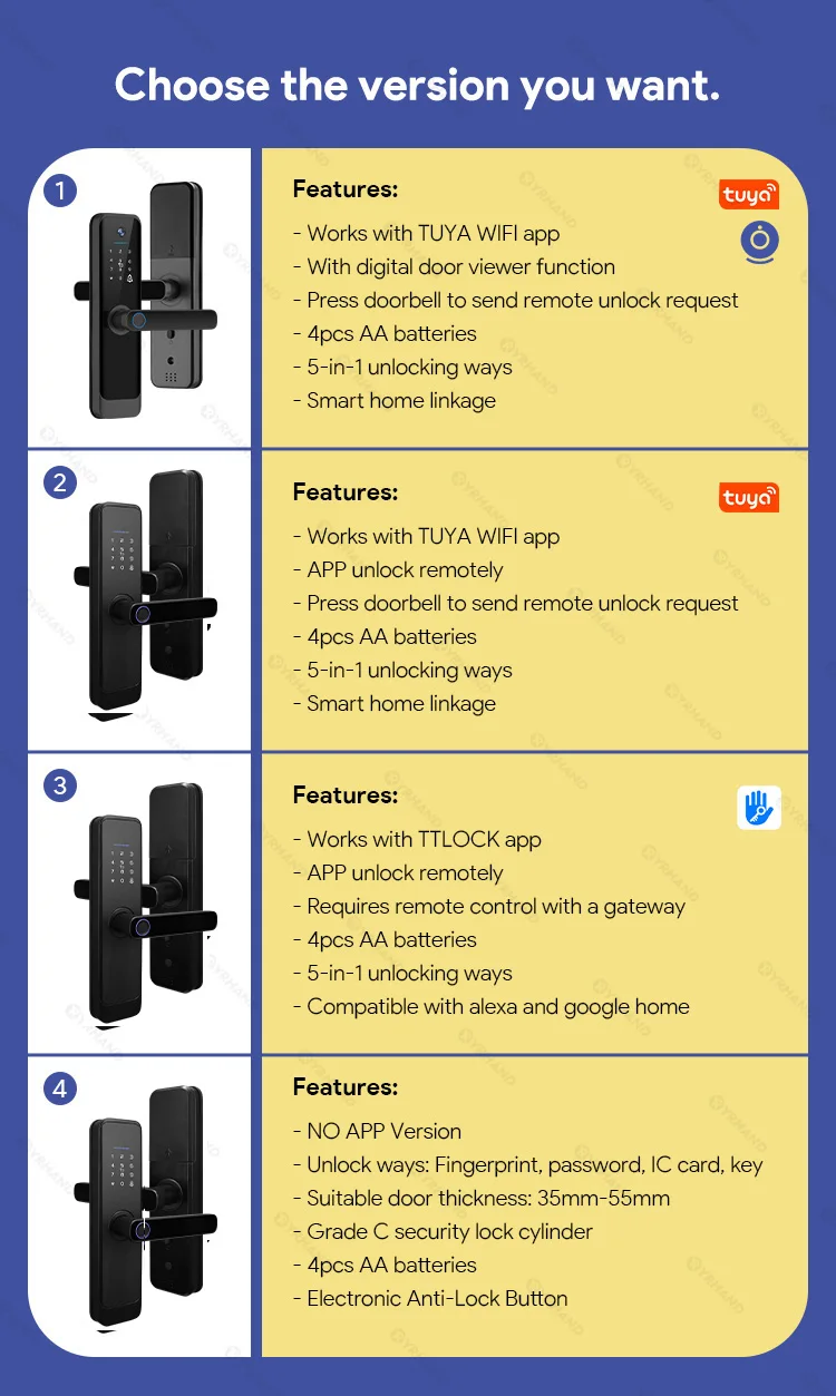 Turėdami 5 skirtingus atrakinimo būdus, įskaitant telefono programėlę, pirštų atspaudus, slaptažodžius ir raktų pakabukus, taip pat 5 tradicinius raktus, jums niekada nereikės nerimauti, kad vėl užsirakinsite.