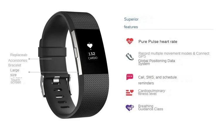 Fitbit Charge 2 Fitness Tracker Smart Wristband Heart Rate Monitor Sleep Steps Call Reminder GPS Sports Watch for iOS Android