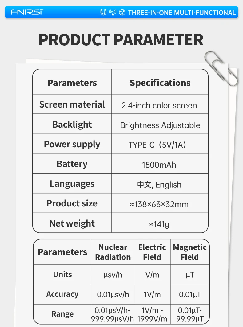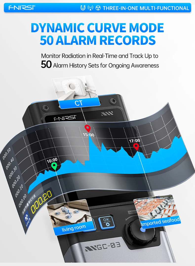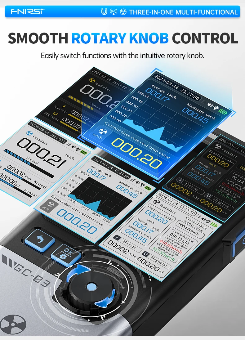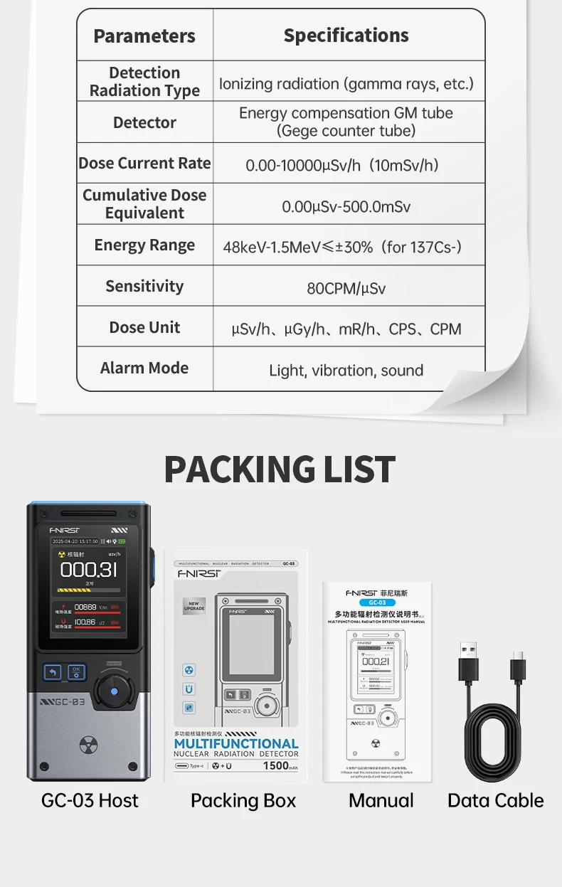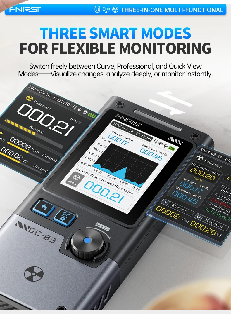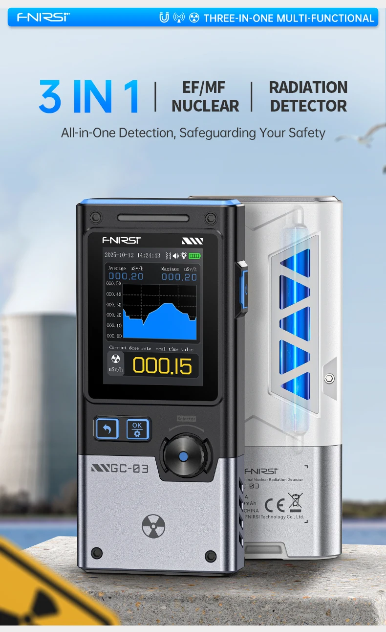GC-03 yra daugiafunkcis detektorius, profesionalus prietaisas nr matavimui, daugiausia naudojamas įvairiomis progomis, tokiomis kaip namai, biuras, lauko aplinka ir kt. Jis naudoja 2,4 colio didelės raiškos spalvotą ekraną ir palaiko nr, elektrinio lauko stiprumo ir magnetinio lauko stiprumo stebėjimą realiuoju laiku.