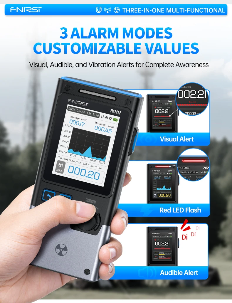 Įrenginys leidžia vartotojams pasirinkti matavimo vienetus. Galimi vienetai: μs v/h, uGy/h, mR/h, CPS, CPM ir kt.