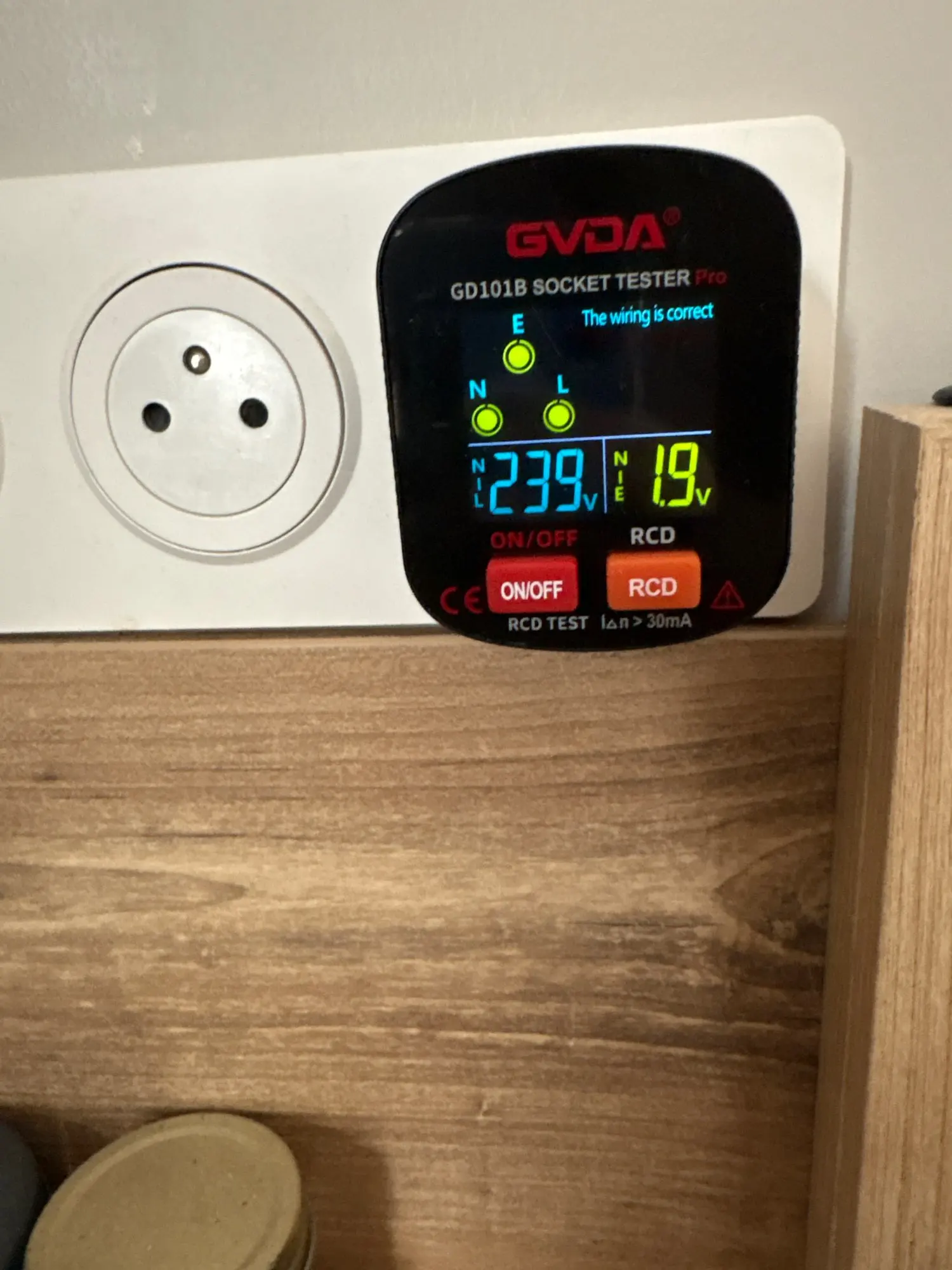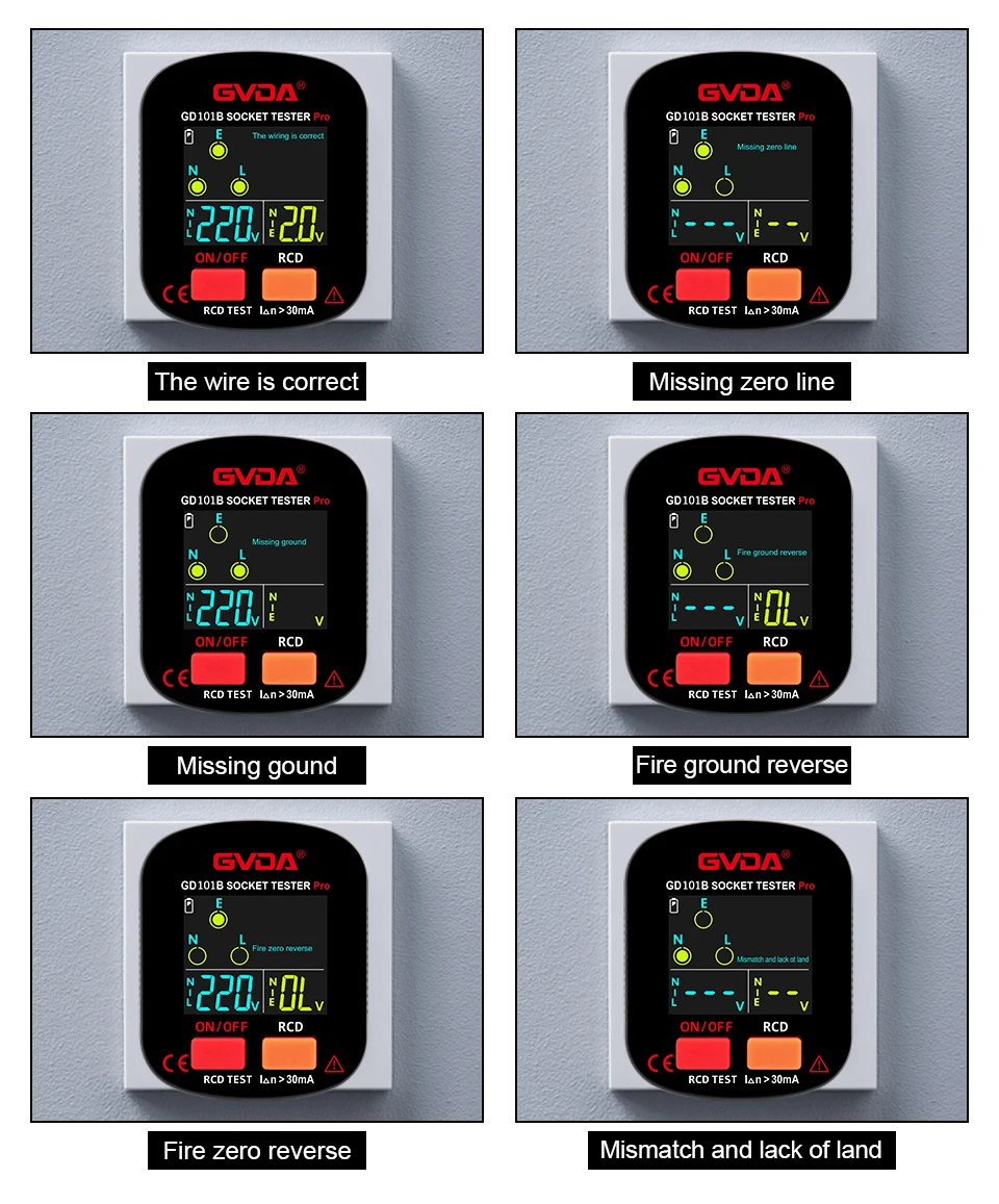 Įkiškite testerį į lizdą ir, kai ekrane pasirodys pranešimas „teisingas laidų sujungimas“ (paspaudimo laikas trumpesnis nei 3 sekundės), paspauskite RCD mygtuką. Tuomet suveiks įprastas nuotėkio jungiklis. Jei nesuveikia, tai reiškia, kad nuotėkio jungiklis sugedo arba jo nėra. Laiku kreipkitės į profesionalų elektriką dėl techninės priežiūros.