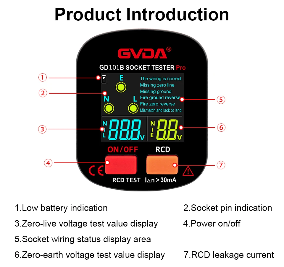 Šis lizdų testeris yra saugus ir paprastas naudoti, jis turi šias funkcijas: spalvotą ekraną, lizdo poliškumo aptikimą, nuotėkio aptikimą, automatinį išsijungimą.