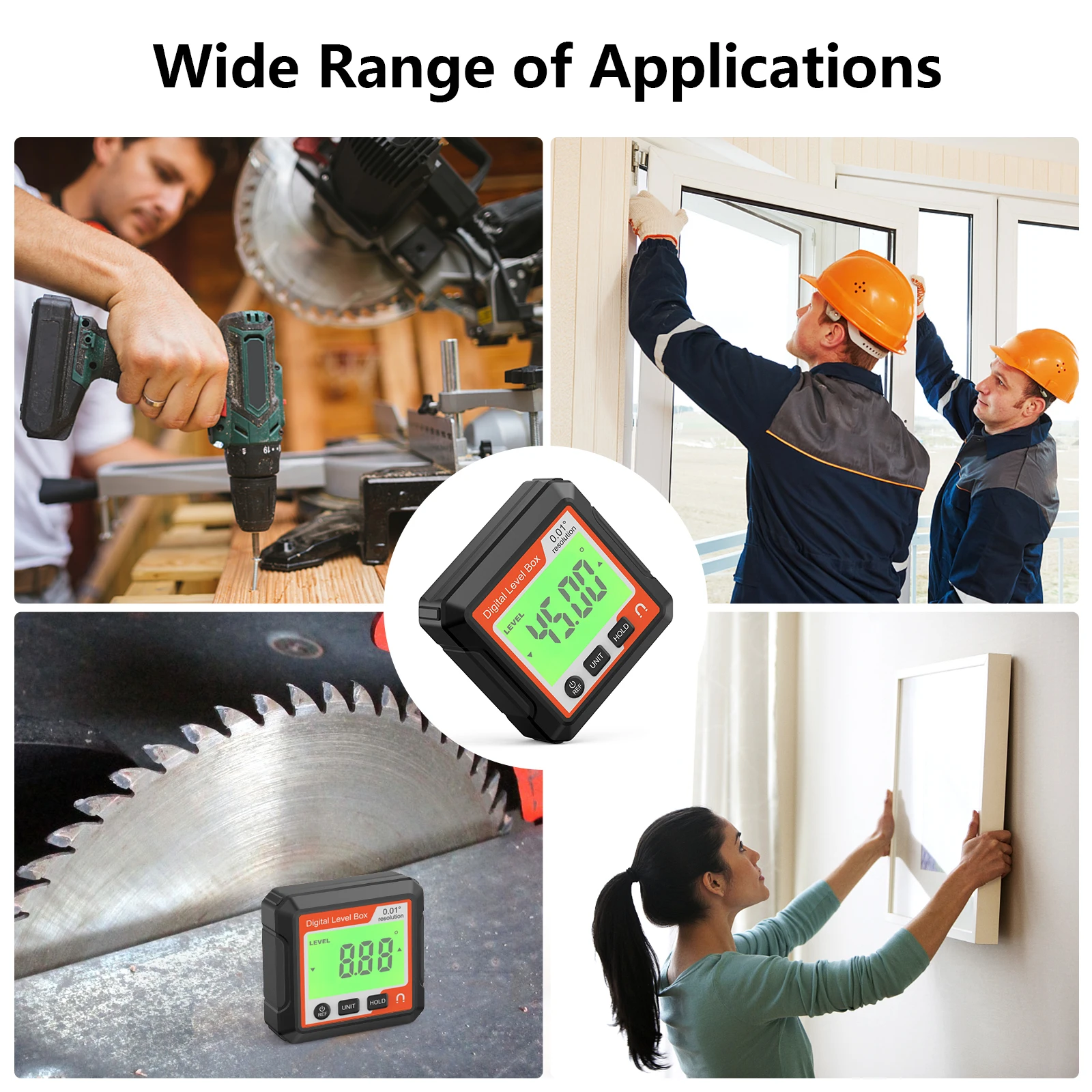 Šis universalus posvyrio matuoklis turi didelį LCD ekraną, o didelis šriftas ir foninis apšvietimas leidžia aiškiau matyti duomenis net tamsiose vietose. Kampo posvyrio matuoklis palaiko absoliučius ir santykinius matavimus, absoliučiojo matavimo režimo rodmuo yra santykinis absoliučiojo gulsčiuko kampas, o santykinio matavimo režimo rodmuo yra kampas, palyginti su absoliučiu gulsčiuku. Daugiafunkcis matavimo įrankis, kampamatis, posvyrio matuoklis ir gulsčiukas viename konstrukcijoje, 4 * 90° matavimas, su duomenimis, fiksavimo funkcija ekranui užfiksuoti, kad būtų lengviau skaityti, kampo ir nuolydžio konvertavimo funkcija. Jis plačiai naudojamas medienos apdirbimo pramonėje tiksliam medienos kampo pjovimui; automobilių remonto pramonėje tiksliam padangų kampo valdymui; mechaninio apdirbimo pramonėje tiksliam įrankio darbinio kampo padėčiai, taip pat didelių transporto priemonių svirčių sukimosi kampui ir kt.
