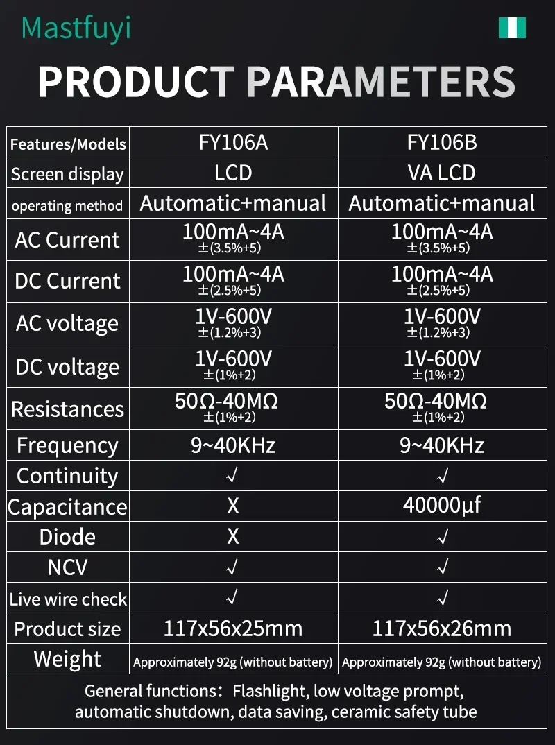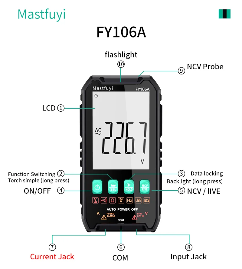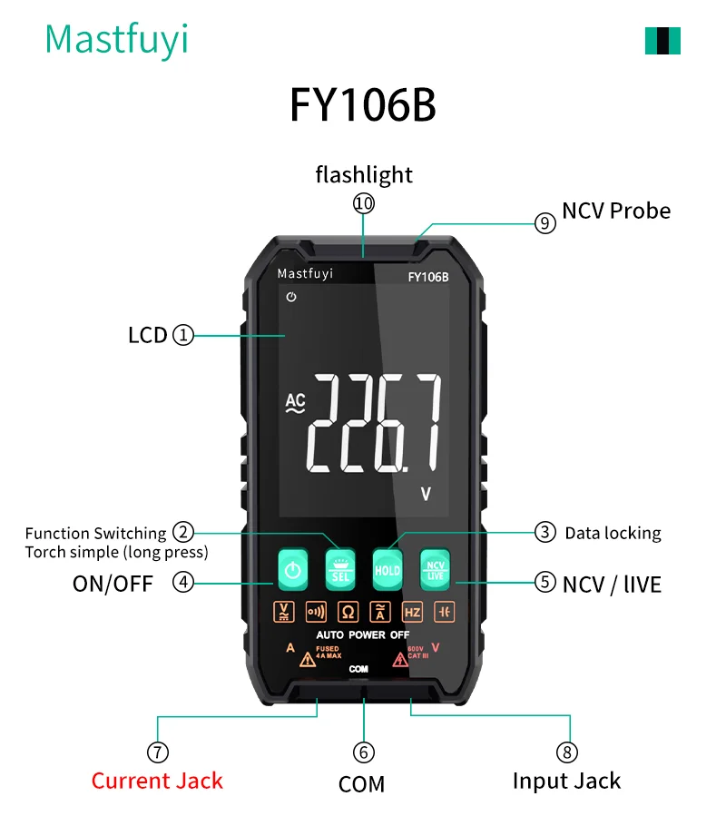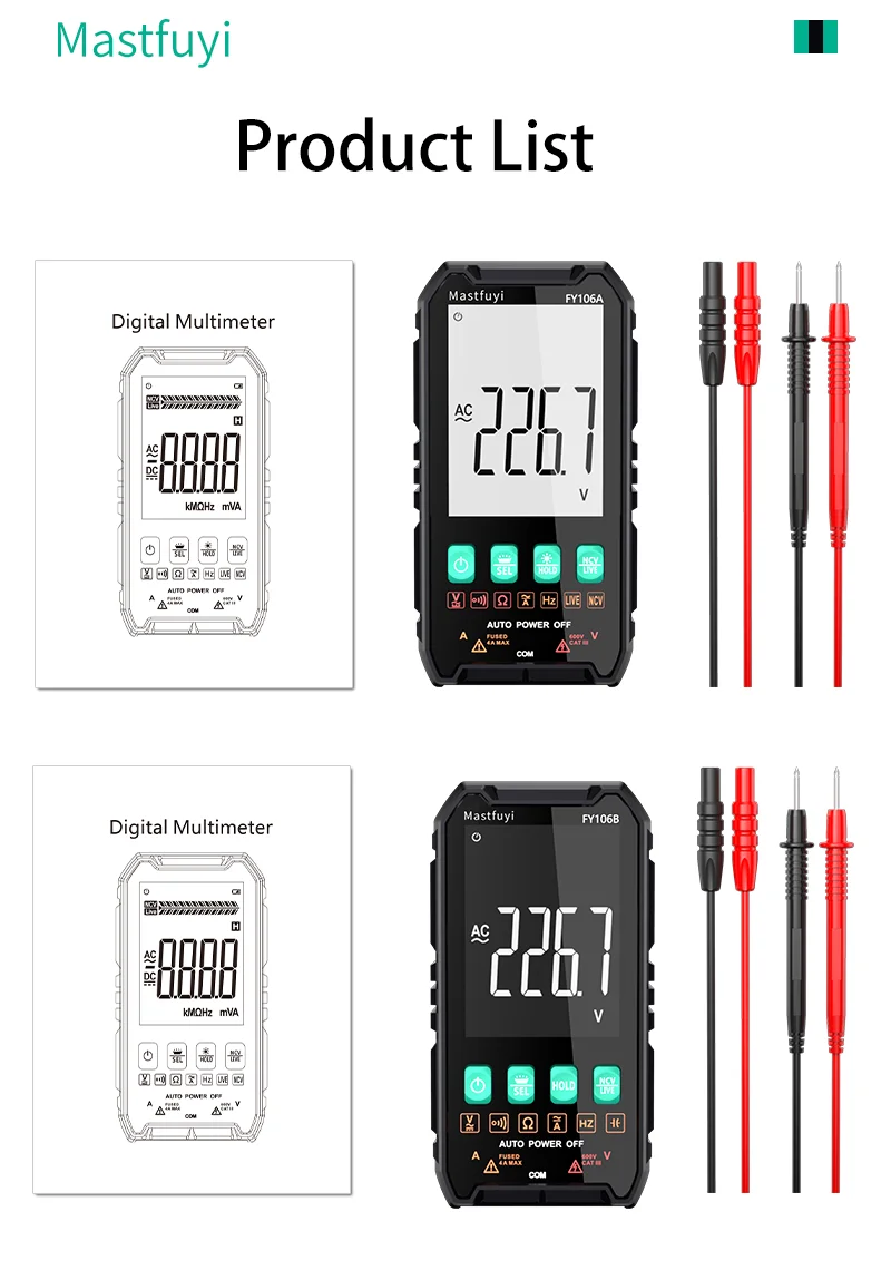 MASTFUYI skaitmeninis multimetras AC DC NCV išmanusis testeris Multimetras Ohm įtampos matuoklis Automatinis diapazonas 600V Profesionalus elektriko testeris