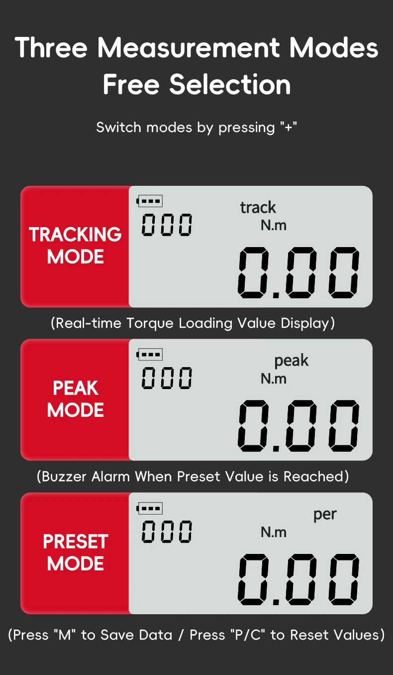 Trys darbo režimai: rinkitės iš realaus laiko, piko ir iš anksto nustatytų režimų, kad pritaikytumėte sukimo momento stebėjimą savo konkretiems poreikiams.