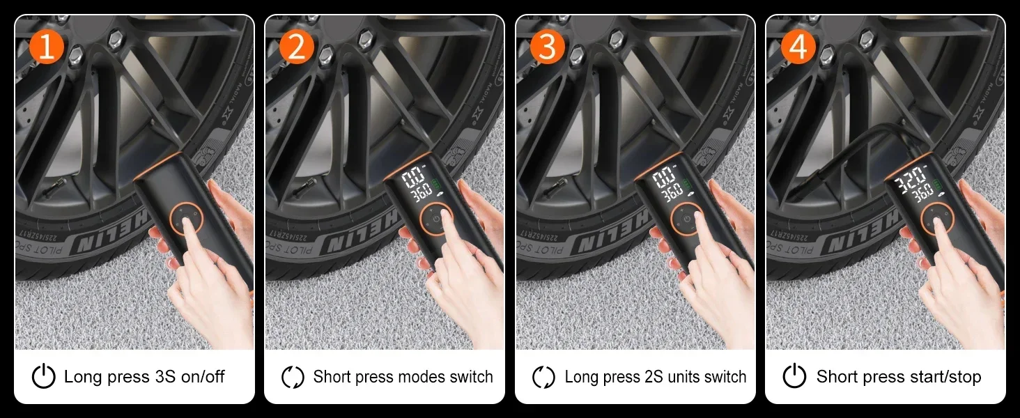 【 5 režimai ir 4 vienetai 】 : Apima 4 iš anksto nustatytus režimus ir pritaikomą 5-ąjį režimą, palaikančius PSI, BAR, KPA, kg/cm² su lengvu vienetų konvertavimu, puikiai tinka automobiliams, motociklams ir kitų transporto priemonių priedams.