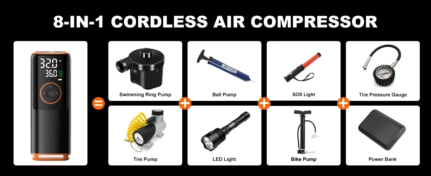 【 Universalus daugiafunkcis įrenginys 】 : Apjungia padangų pompą, pripučiamą pompą, LED lemputę, padangų matuoklį ir išorinę bateriją į vieną universalų įrankį, tinkantį įvairiems automobilių priedams, motociklams ir kt., siūlant išsamų sprendimą visiems jūsų automobilio priedams ir aksesuarams.