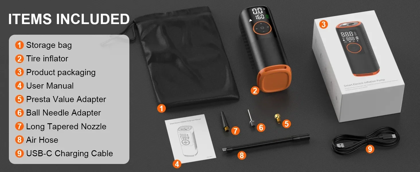 Į komplektą įeina 1 x automobilio padangų pripūtimo antgalis su manometru, 1 x oro žarna, 1 x „Presta“ vožtuvo adapteris, 1 x rutulinės adatos adapteris, 1 x ilgas kūginis antgalis, 1 x laikymo krepšys.