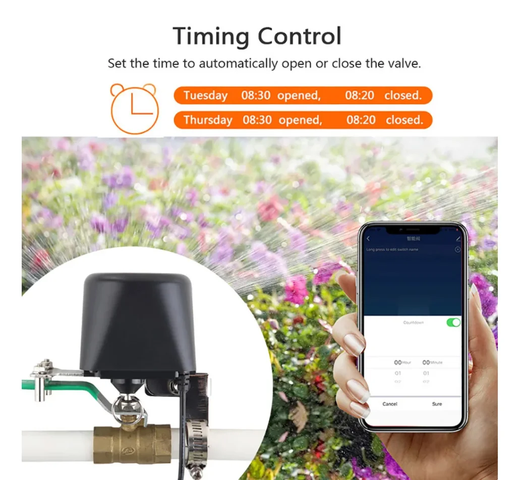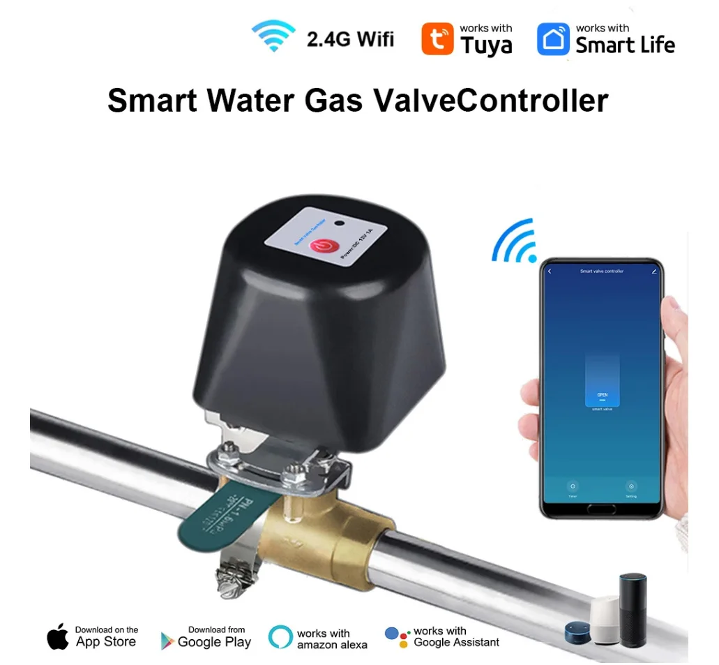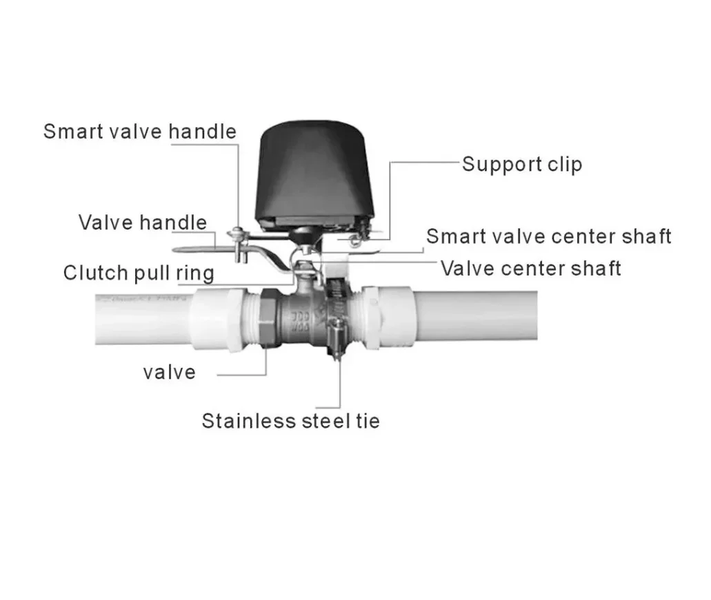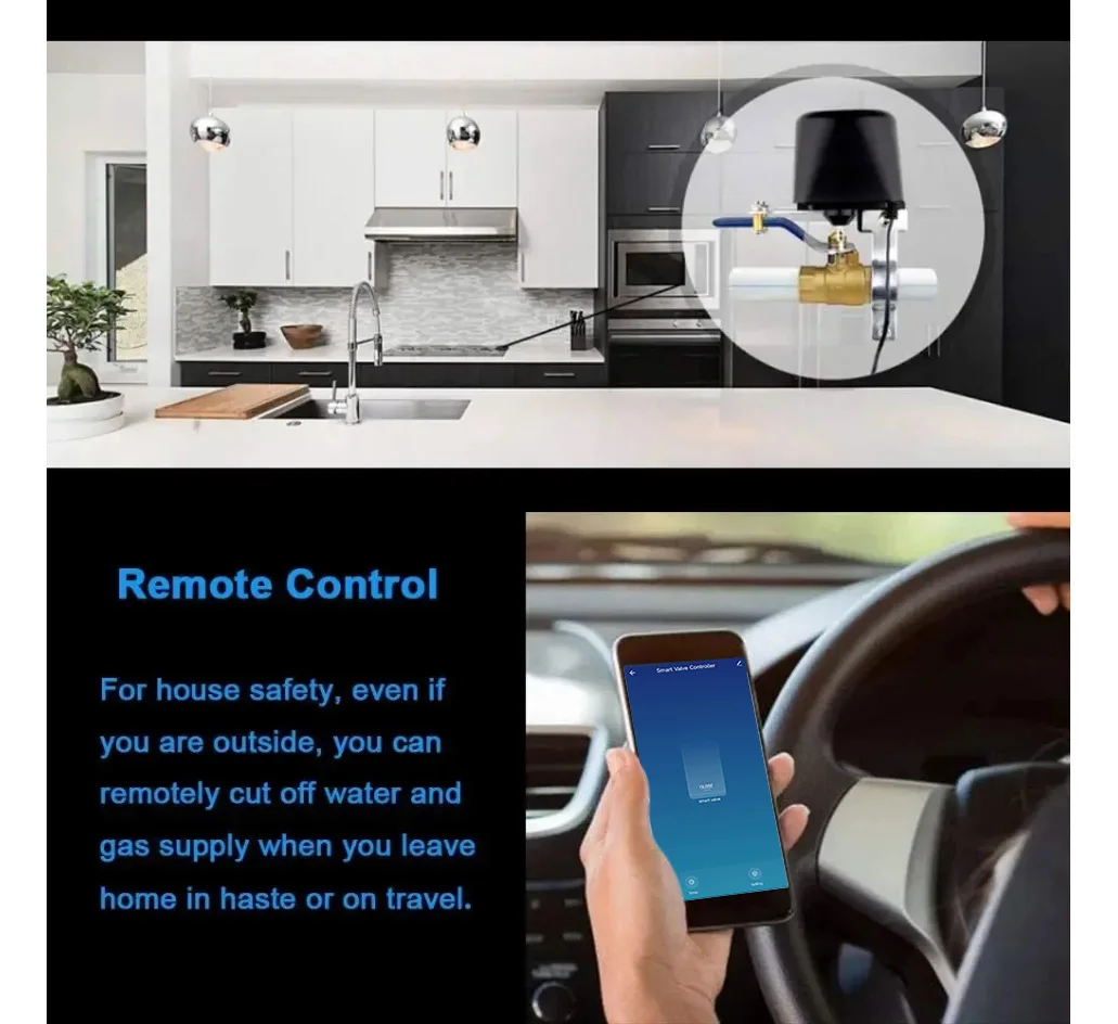 Išmanus priedas prie esamo vandens ar dujų rutulinio vožtuvo. Tiesiog pridėkite šį išmanųjį vožtuvo valdiklį prie savo vandens ar dujų uždarymo vožtuvo ir galėsite paprastai valdyti vandens tiekimą arba išjungti dujų vožtuvą iš bet kurios vietos bei bet kuriuo metu naudodami nemokamą „Smart Life“ programėlę.
