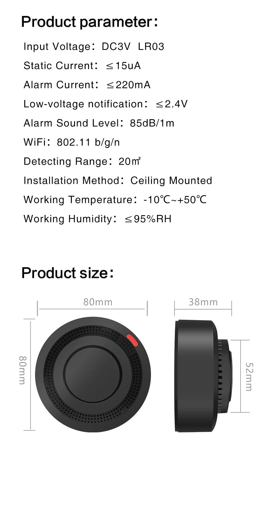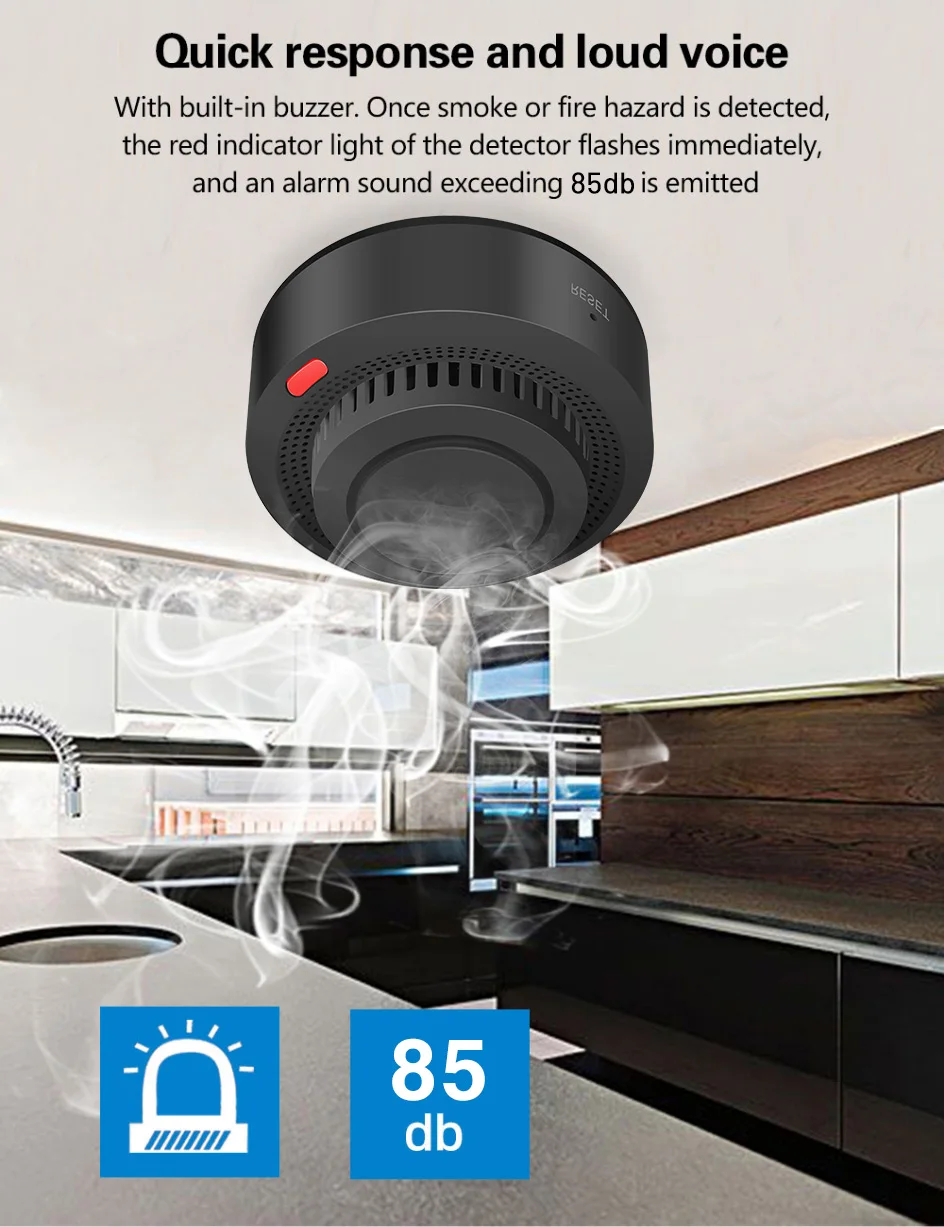 【 85 dB aliarmo garsas 】 Dūmų detektorius turi įmontuotą 85 dB aliarmo garsą, leidžiantį žmonėms laiku reaguoti ir greitai susidoroti su situacija.