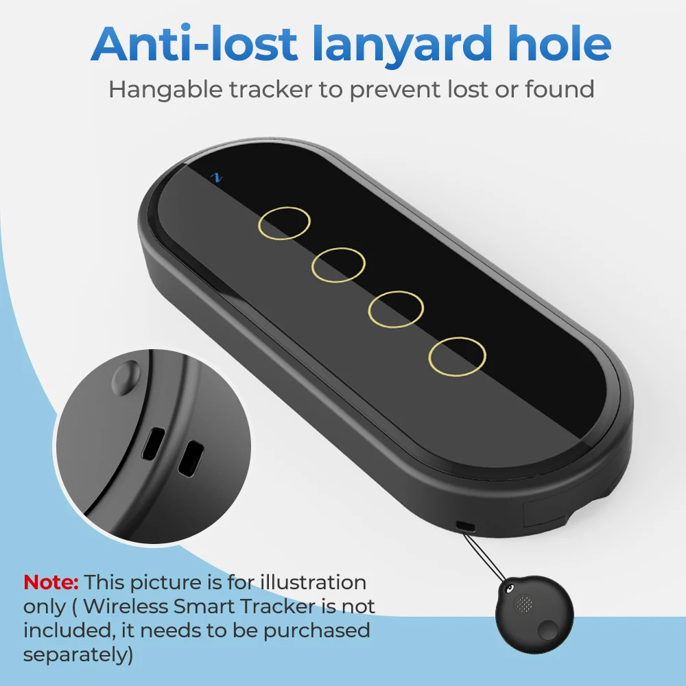[Virvės skylės dizainas] Kad nuotolinio valdymo pultas nepamestų, jį galima naudoti su mūsų „Bluetooth“ apsaugos nuo pametimo įrenginiu, kad būtų galima greičiau jį rasti (atkreipkite dėmesį, kad apsaugos nuo pametimo įrenginį reikia įsigyti atskirai).