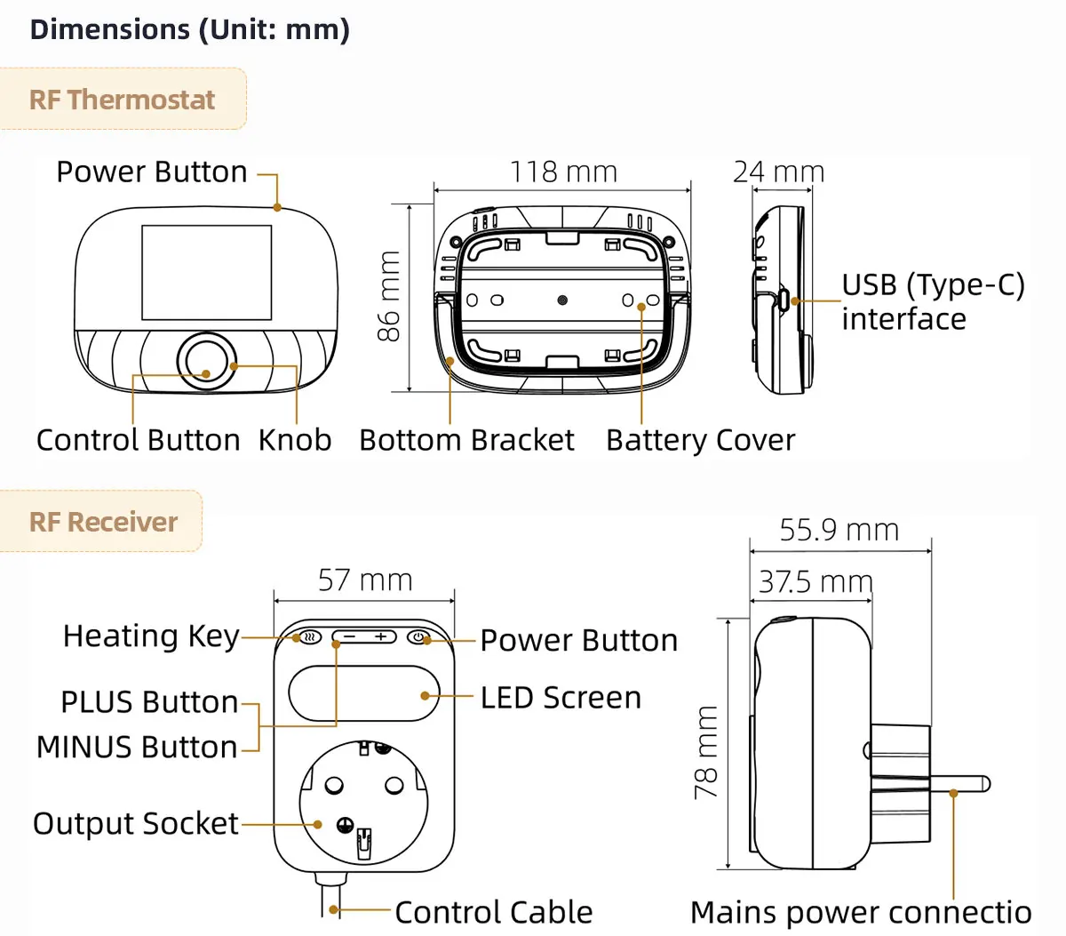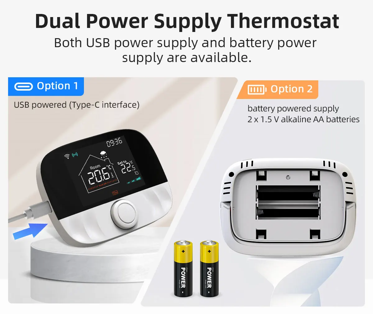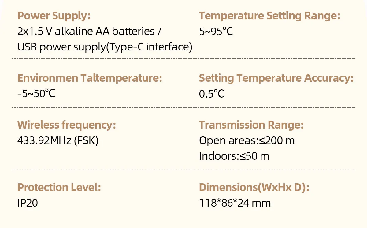 Termostato maitinimas : 2 x 1,5 V šarminės AA baterijos / USB maitinimo šaltinis (C tipo sąsaja)