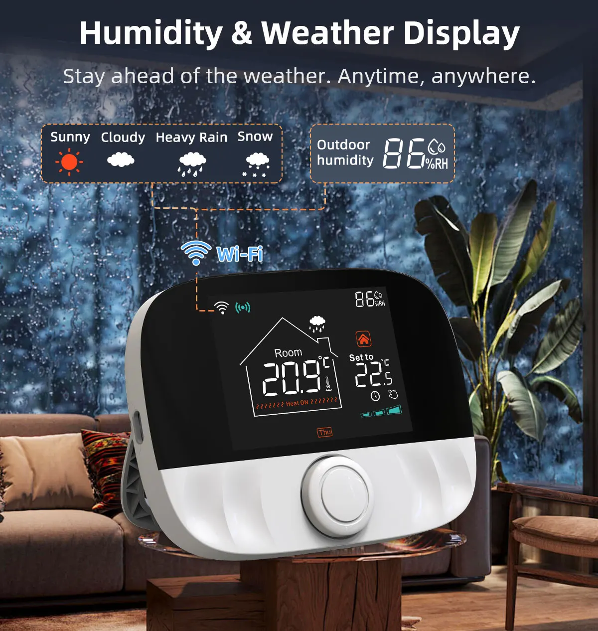 „Wi-Fi“ ryšys sinchronizuoja realiuoju laiku vietinę temperatūros, drėgmės ir orų informaciją.