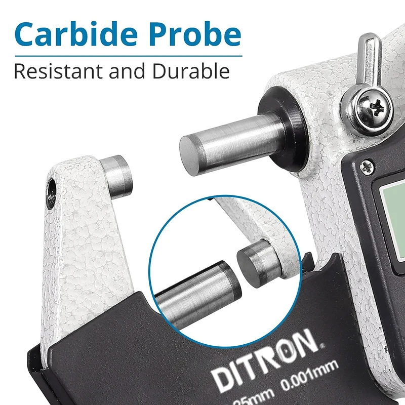 Измерительные поверхности с наконечниками из твердого карбида обеспечивают износостойкость; храповой механизм и фиксированный наконечник.