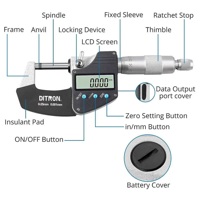 Высококачественный цифровой наружный микрометр с возможностью выбора диапазона измерения и плоской наковальней/шпинделем.